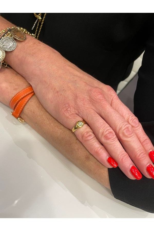 This modern solitaire is set in its center with a 0.30 carat diamond. Type of jewelry: Ring Metal : 18 carat yellow gold (750/1000) Weight: 3g Size: 49 - Fit to size on request Available: Jewelry store rue Saint James For any further information, contact us from Tuesday to Saturday from 10 a.m. to 6 p.m.
