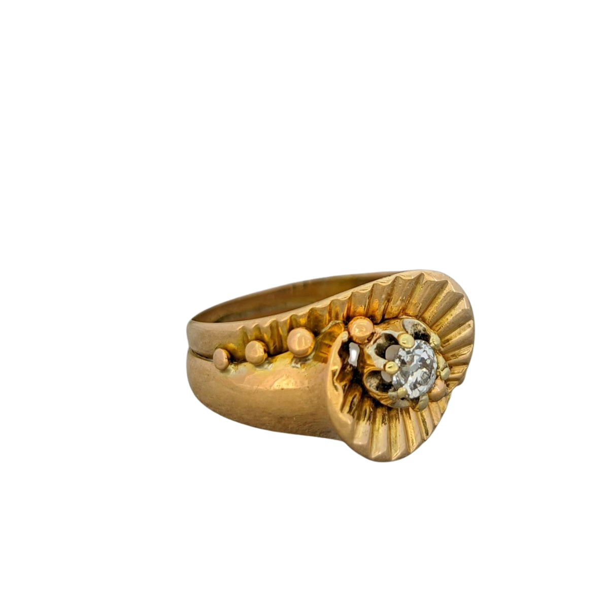 Yellow gold and diamond ring 18 carats - 750 thousandths Gross weight: 5.96gr Finger size 52 mm Central diamond approximately 3.8 mm Width of the top of the ring 12 mm