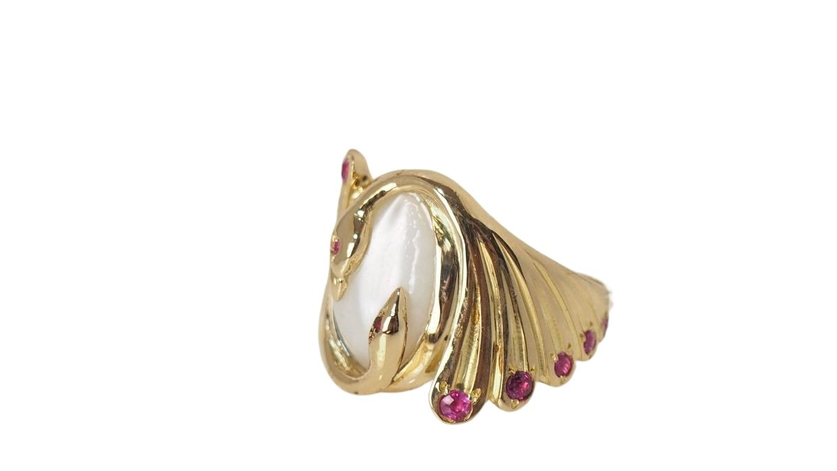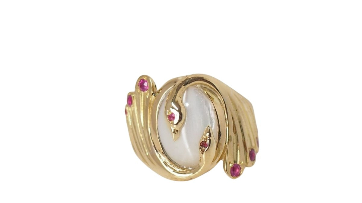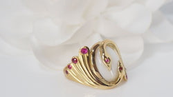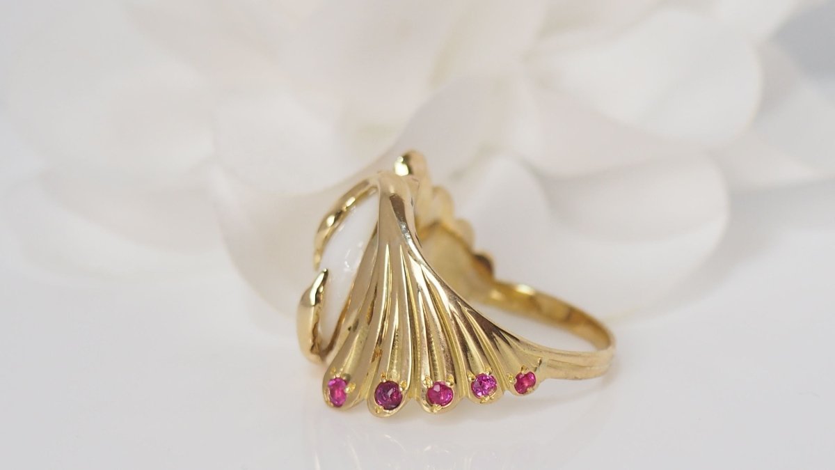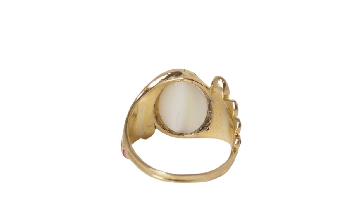 You and Me ring ; 18kt/750 thousandths yellow gold ; Adorned with a 14x10mm Moonstone ; Set with small rubies ; Weight: 9.70g; Size: 61.