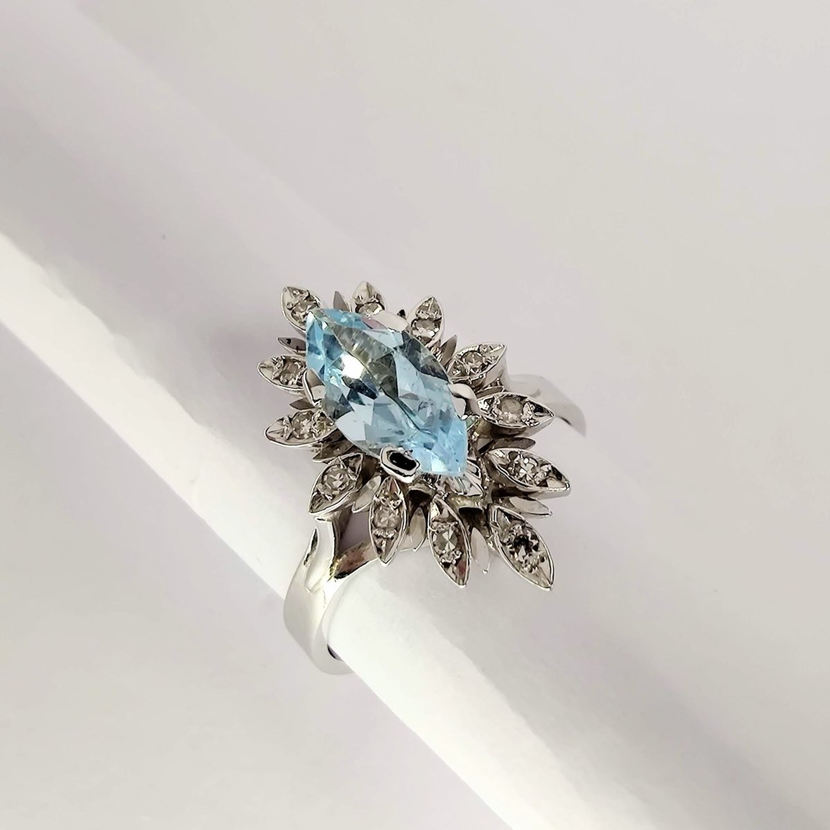 Ring in 18-carat white gold - 750 thousandths diamonds and topaz 12 rose-cut diamonds Average total diamond weight: 0.1 carat Topaz 10 x 5 mm Ring head size: 19 x 11 mm Finger size: 52 Gross weight: 4.9 g Polished, Rhodium plated, Authenticity and quality controlled, Refurbished