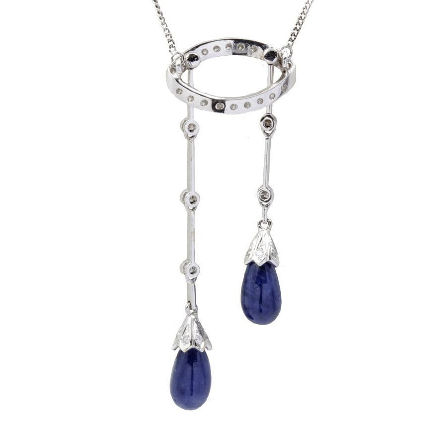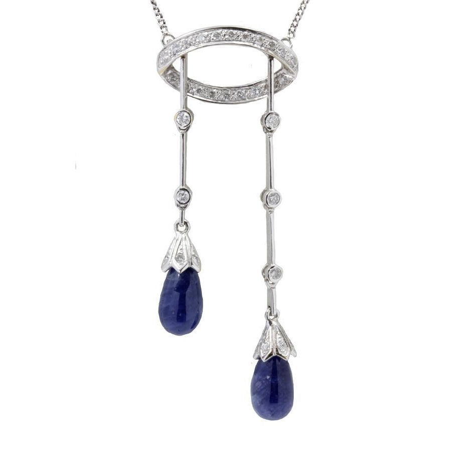 This modern necklace called 'negligé' is inspired by the Art Deco era. Jewelry type: Necklace Metal : 18 carat white gold (750/1000) Stone: Sapphire - Diamond Sapphire weight: 2 x 2 carats Diamond weight: 0.60 carat Weight: 9.2g Length: 42cm Hallmark: Eagle head Available: Jewelry store rue des Remparts