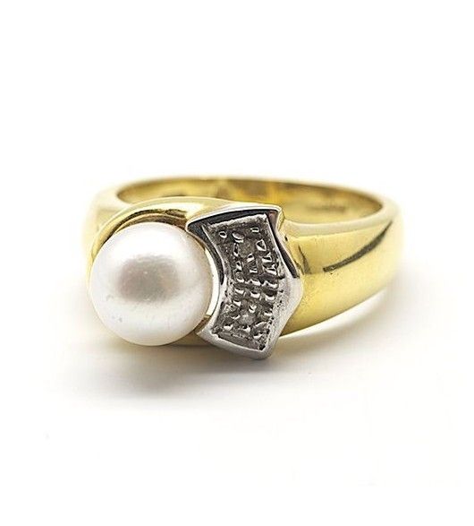 750 yellow gold ring set with a white cultured pearl 7.4 mm in diameter and diamonds. Finger size: 53 Possible resizing.