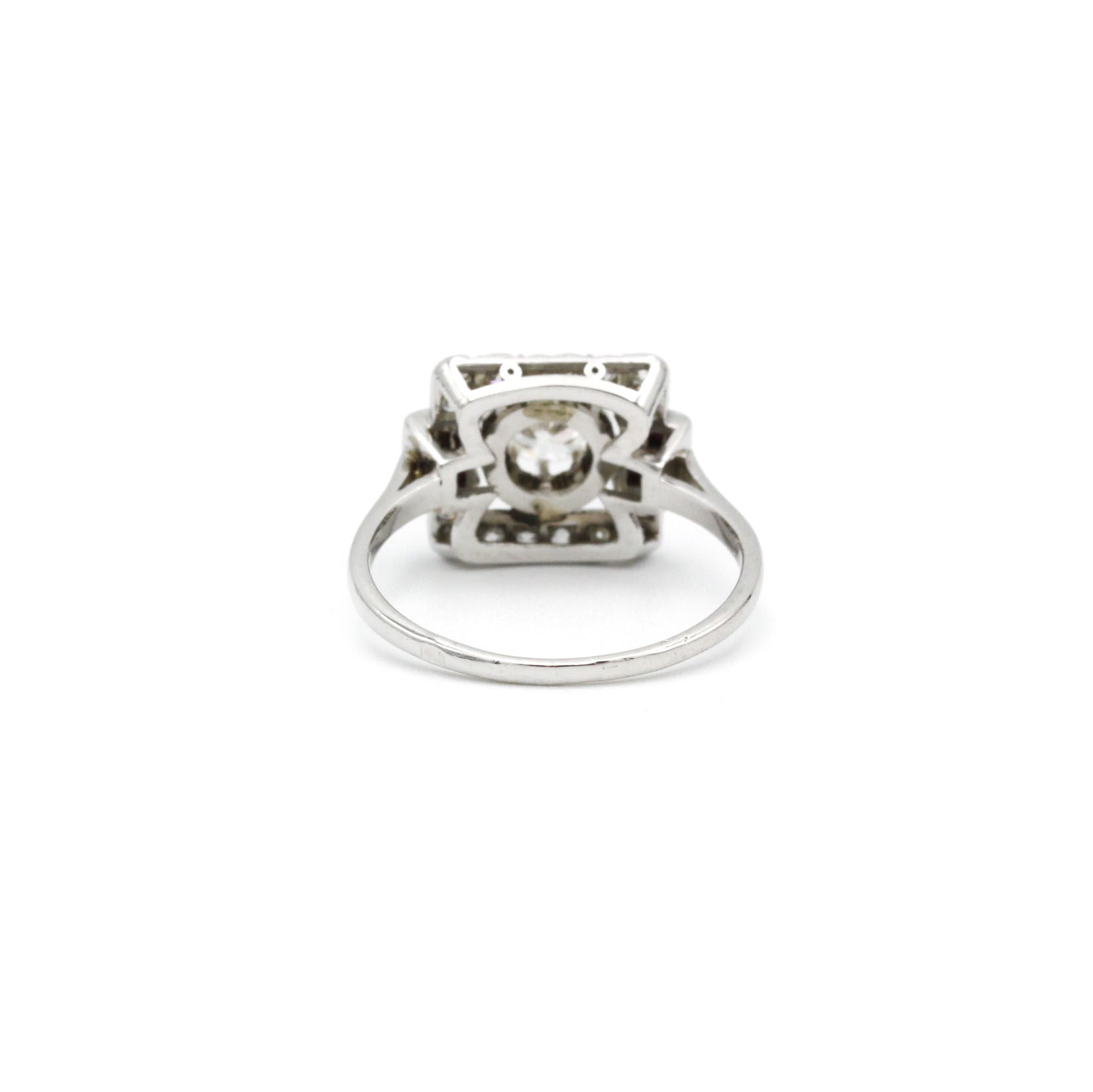 Ring in 900‰ Platinum, set with an old-cut diamond of approximately 0.50 carat (I SI), small calibrated rubies (égrisés) and surrounded by old-cut diamonds. Finger size: 56 Resizing possible. Weight: 4.68 grs