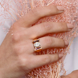Tank ring in yellow gold with diamonds and tourmalines 18 carats - 750 thousandths Gross weight: 7.45 gr Finger size 56 mm Ring adorned with 6 rose-cut diamonds, and a central old-cut diamond. On the sides of the knot, we can appreciate 4 Rubellites (Tourmaline). Ring head width: 15.7mm