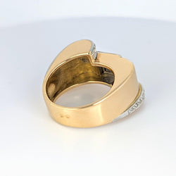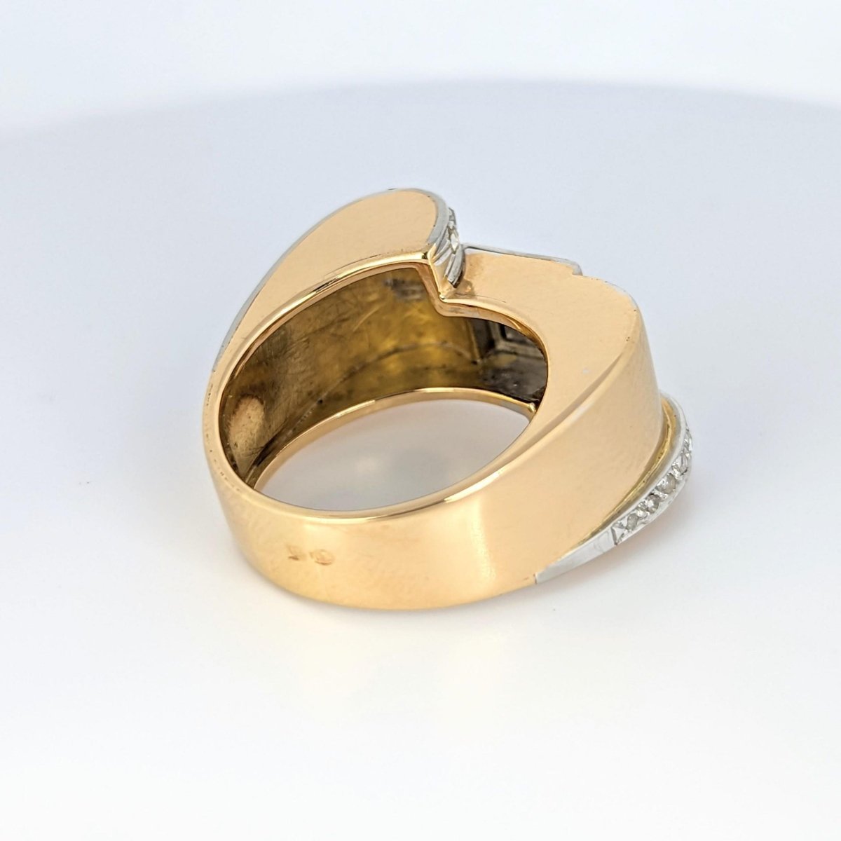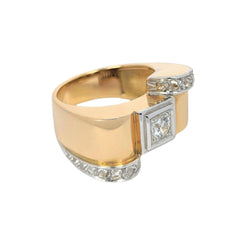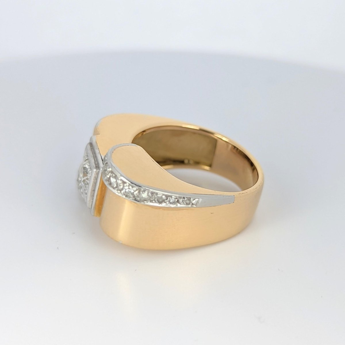 Tank ring in yellow gold, platinum and diamonds 18 carats - 750 thousandths / 950 platinum Gross weight: 9.7 gr Finger size 55 mm Width of top of ring: 15 mm Length of top of ring: 25 mm Thickness: 7mm Average total diamond weight: 0.3 carat