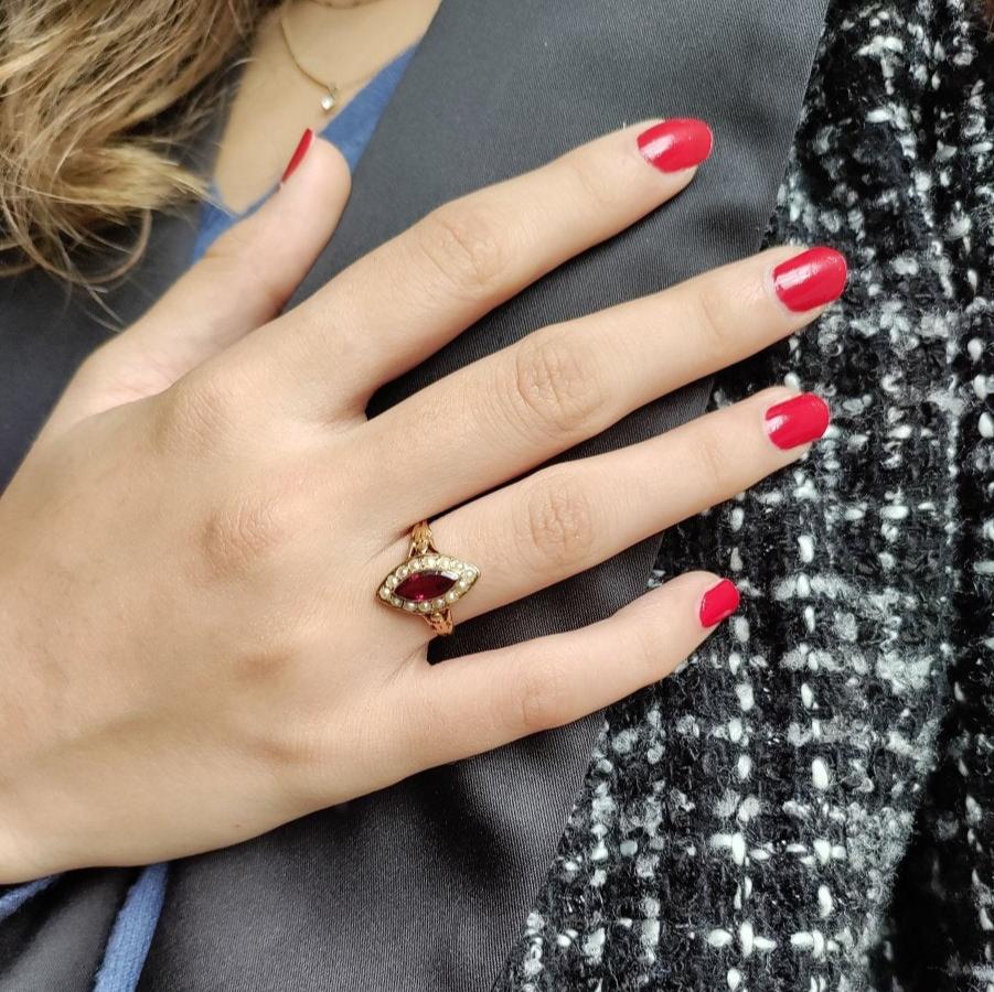 Marquise 750/1000 yellow gold (18k) ring, from the Napoleon III period, set in its center with a garnet, surrounded by 14 small white pearls. Condition: Good general condition, some scratches on the lamination of the garnet Dimensions: garnet 10 mm / 3 mm and the bezel: 15 mm / 8 mm Hallmarks: eagle head outside the ring Gross weight: 2.33 gr Finger size: 50.5 ref. 496