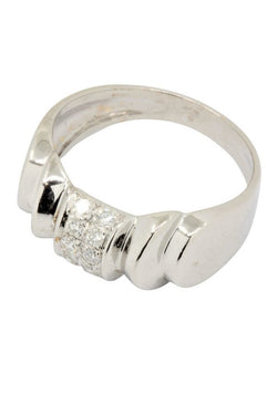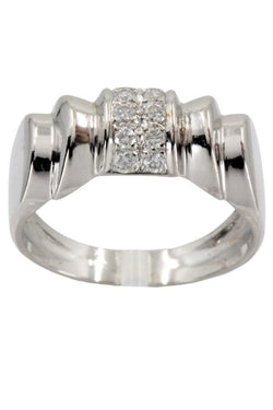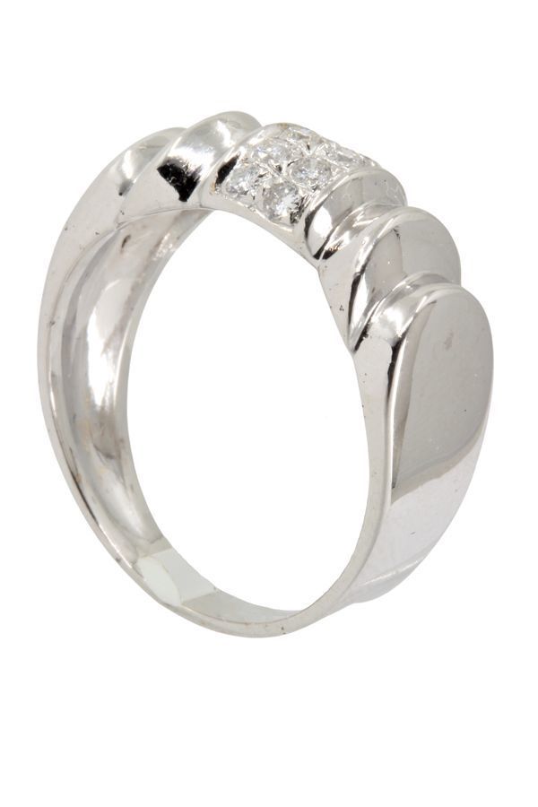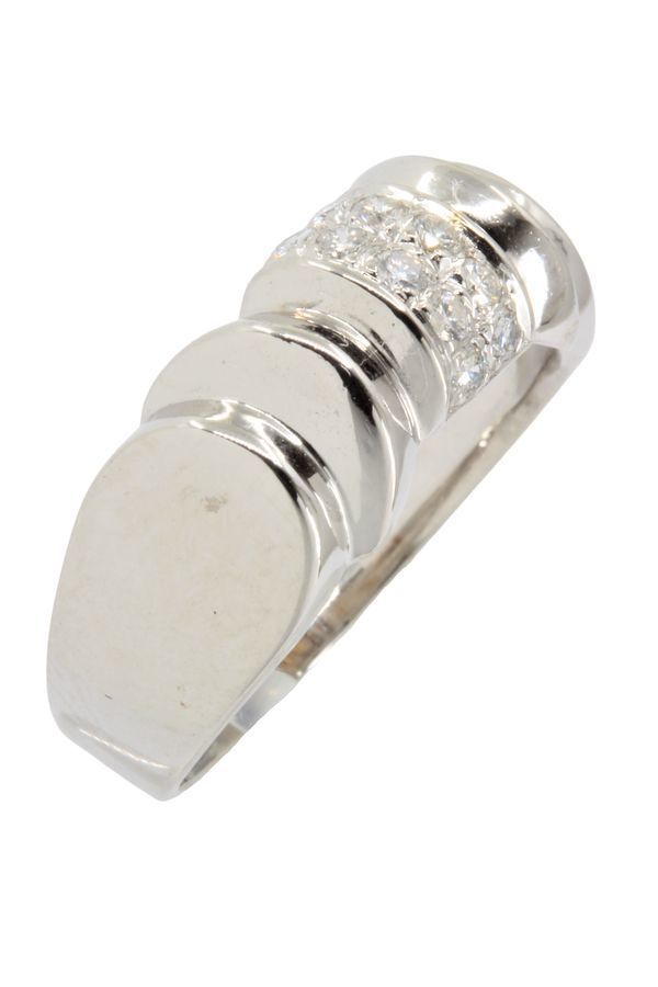 This modern ring is inspired by the so-called tank models from the 1940s, it is set with diamonds. Metal: 18 carat (750/1000) white gold Weight: 5.1g Stone: Diamond Diamond weight: 10 x 0.04 carat Size: 52 - Fit to size on request Hallmark: Eagle head