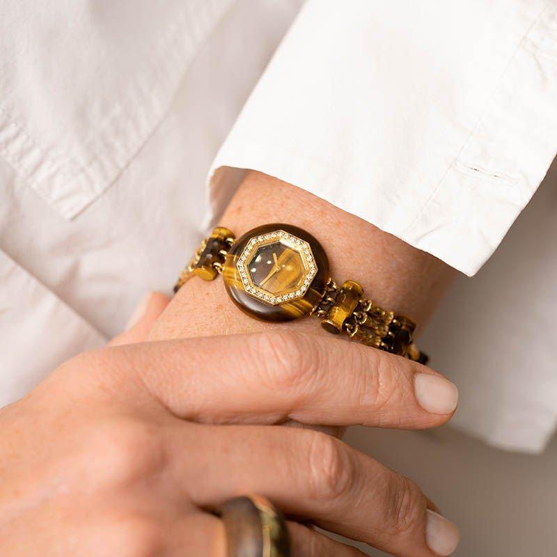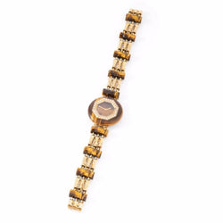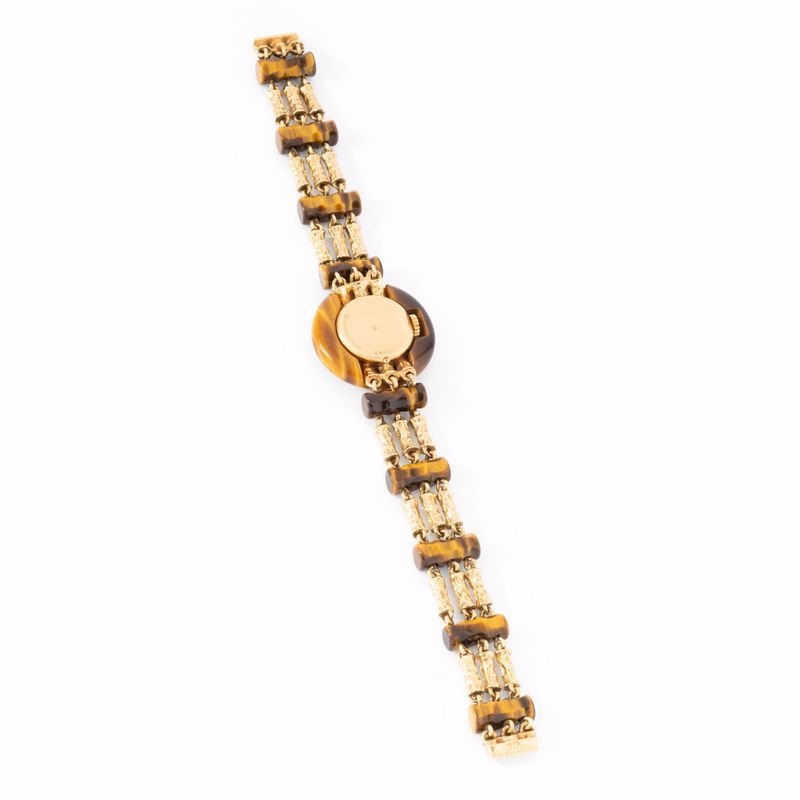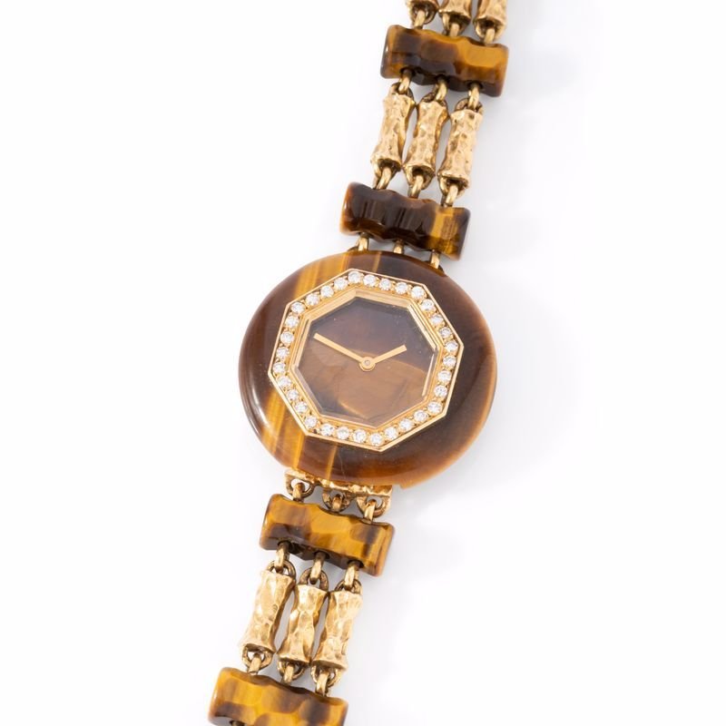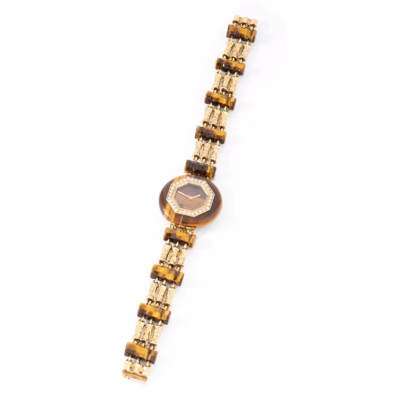 BOUCHERON ladies' watch in 18-carat yellow gold, the bracelet is made of yellow gold sticks connected by tiger's eye elements. Dial, Tiger's Eye highlighted by an octagonal line of diamonds. Signed and numbered. Circa 1970.