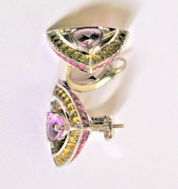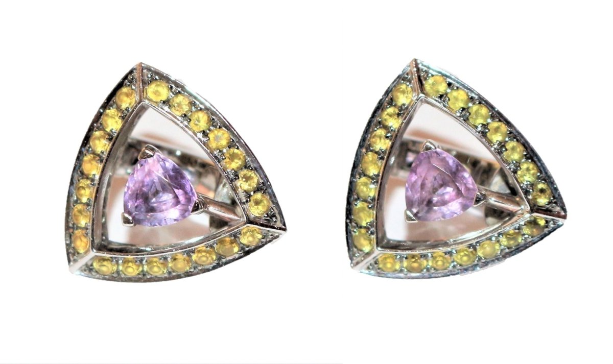 Mauboussin, pair of earrings for pierced ears in 750 (18k) white gold, each adorned with a claw-set troidia amethyst, surrounded by 21 yellow sapphires and supported by 24 pink sapphires. Hallmarks: Mauboussin Paris 750 (for 18k gold ) + number F3024 + Maison Mauboussin hallmark on each gross weight: 11.17 gr dimensions: triangle of approximately 2 cm side delivered with authenticity card: purchase in 2005 in Paris, place Vendôme. condition: very good general condition ref.413