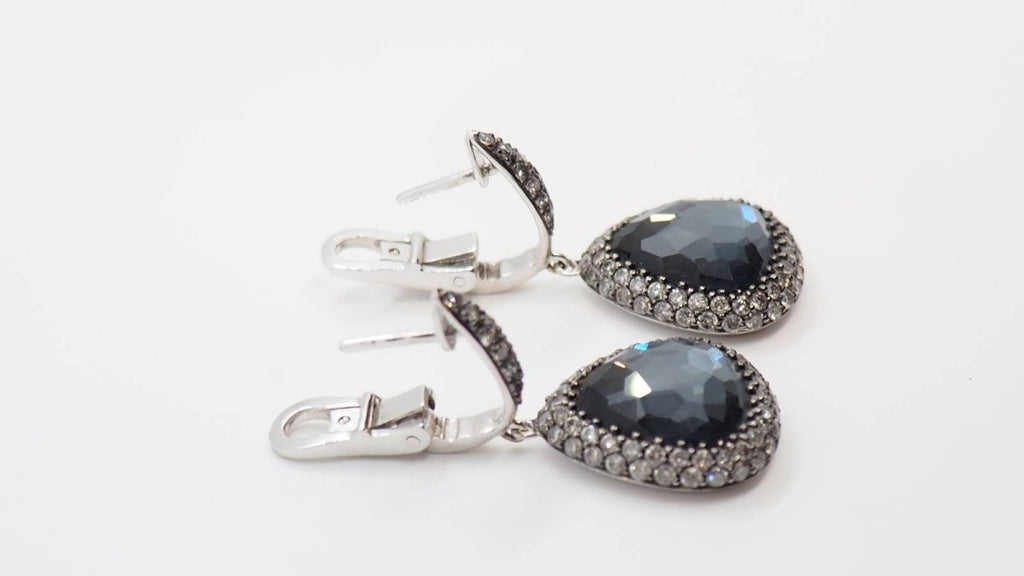 Dangling earrings in 18-carat white gold set with faceted black quartz in the shape of a pear surrounded by 2 rows of diamonds for a total of approximately 1 carat. Total weight: 9.95g Length: 3cm Pattern size: 15 x 15 mm