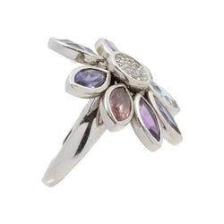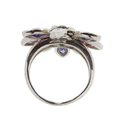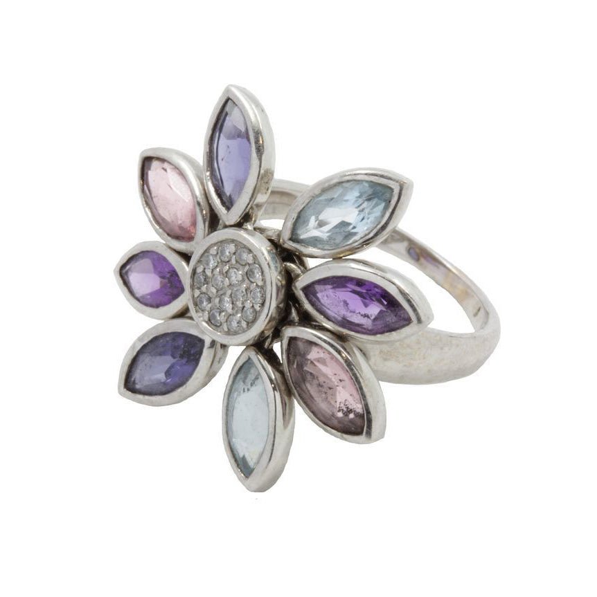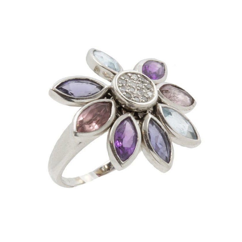 This modern ring is set with diamonds for a total of 0.14 carat in total, its petals are articulated. Metal : 18 carat white gold (750/1000) Weight: 11.2g Stone: Diamond - Amethyst - Blue Topaz - Rose Quartz Size: 57 - Size on request Hallmark: Owl