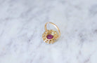Daisy Engagement Ring in 18Kt Rose Gold and Platinum (hallmarks: owl and mascaron), the center of which is decorated with a ruby weighing approximately 1.60 Cts in an entourage of old-style cut diamonds. Total weight of diamonds estimated at approximately 1.90 Cts, color G to H, clarity VS to SI. Ruby accompanied by a Carat Gem Lab certificate, specifying natural Burmese ruby without thermal modifications. Work from the beginning of the 20th Century, Belle Epoque. Gross weight: 4.00g Pattern height: 1.80 cm Pattern width: 1.50 cm Finger size: 52 (diameter 16.50 / US 6.00). Condition: very light micro scratches on the gold and platinum parts, natural inclusions, shocks and scratches in/on the stones, an old cut diamond replaced by a brilliant cut, see photos.