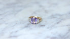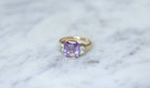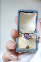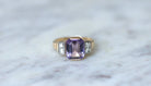 Old Art Deco ring in 18kt pink gold and platinum (hallmark: owl), decorated in its center with an emerald-cut amethyst, supported by 8x8 cut diamonds whose total weight is estimated at approximately 0.20 Ct. Art Deco, Circa 1930. Gross weight: 4.01g Height of the motif: 1.00 cm Width of the motif: 1.50 cm Finger size: 50 (diameter 16.00 / US 5.25). Condition: slight micro scratches on the gold parts, see photos.