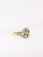 Art Nouveau period ring in 18k (750°/°°) gold and platinum set with two diamonds weighing approximately 0.10 ct each and an emerald of the same weight. The vegetal ring is enhanced with rose-cut diamonds. French work circa 1900. Finger size 54, resizing possible Gross weight: 3.51 grams