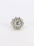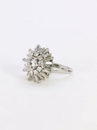 White gold ballerina ring with diamonds Vintage ballerina ring in 18k gold (750°/°°) set in its center with a brilliant-cut diamond weighing 0.87 ct of E VS1 quality. A first entourage of 10 brilliant-cut diamonds for (approximately 0.5 ct) and a second of 20 baguettes (approximately 2 carats) of beautiful quality, form the skirt of the ballerina which gives its name to this type of rings. French work from the 1960s. Traces of eagle's head hallmark for 18 carat gold. Presence of an LFG certificate for the center stone. Finger size 49, resizing possible Gross weight: 10.48 grams