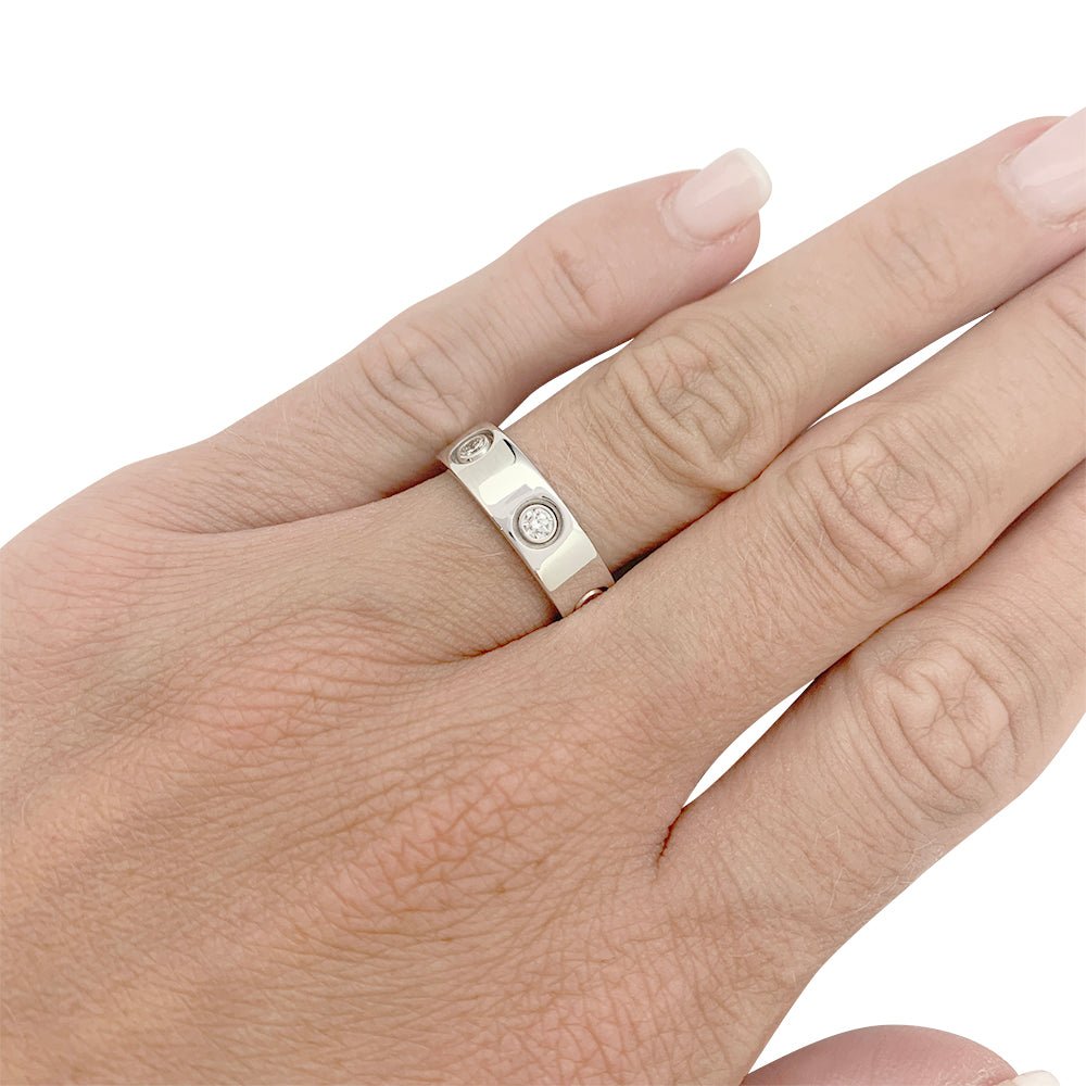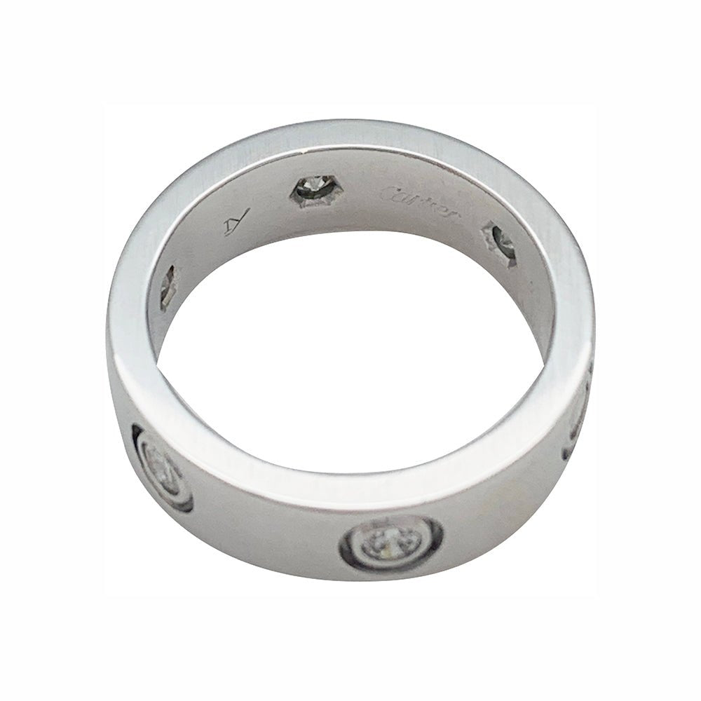 A ring signed by Cartier in 750/000 white gold, 'Love' collection, set with six brilliant-cut diamonds. Total diamond weight: approximately 0.45 carat. Width: 5mm Weight: 8 grams Finger size: 50
