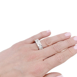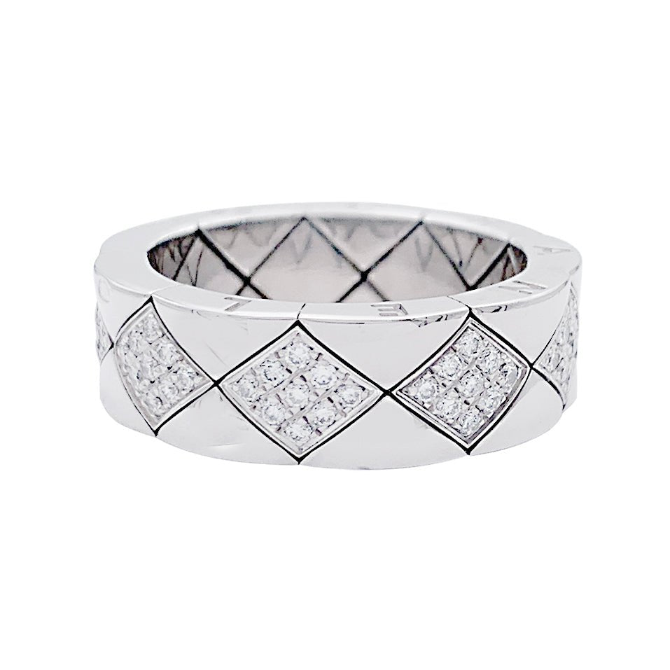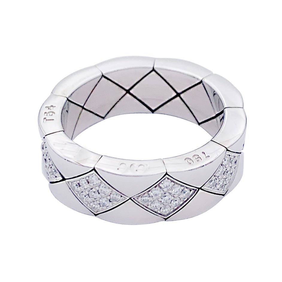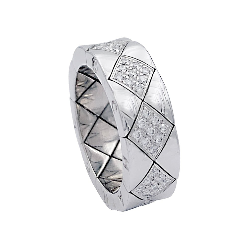 A ring signed by Maison Chanel in 750/000 white gold, 'Matelassé' collection, composed of a semi-articulated mesh featuring the famous quilted pattern partially enhanced with brilliant-cut diamonds. Width: 7mm Weight: 10.9 grams Diamond weight: approximately 0.80 carats in total Finger size: 54