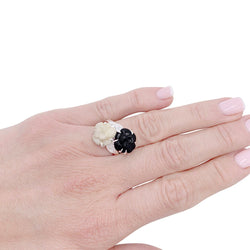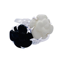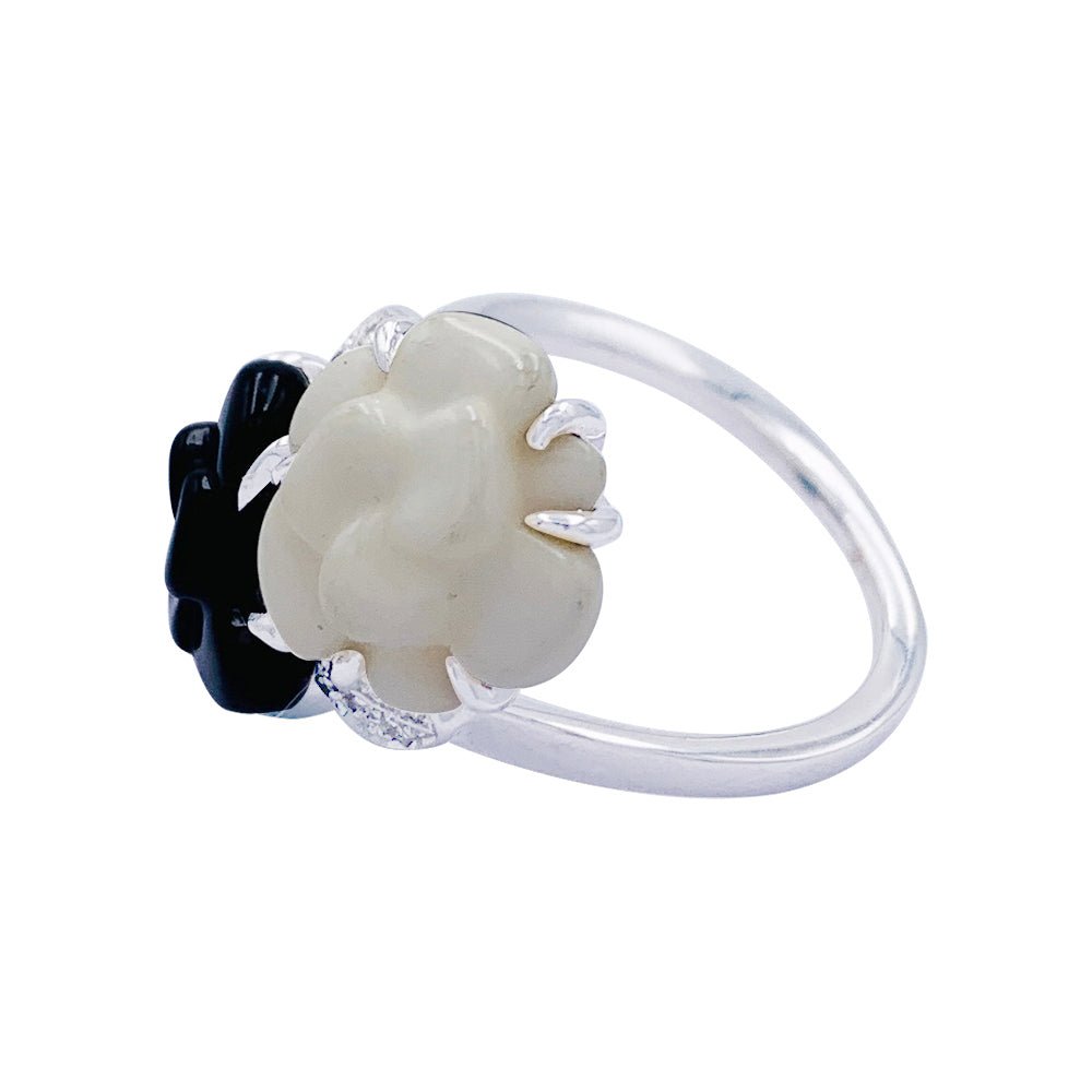 A ring signed by Maison Chanel, 'Toi & Moi - Mini Camélia sculpted', in 750/000 white gold, decorated with two camellia flowers in onyx and white agate. The leaves are set with brilliant-cut diamonds. Weight: 6.8 grams Finger size: 51