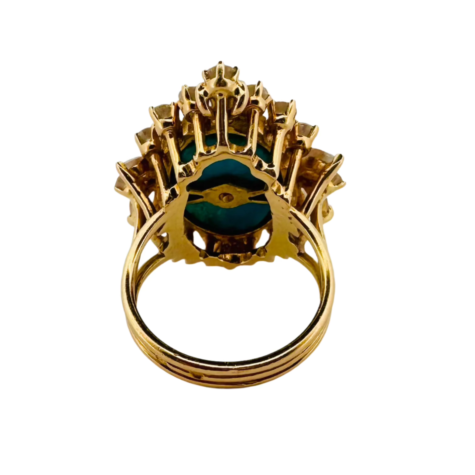 Cocktail ring in 18 carat yellow gold decorated with a turquoise cabochon of approximately 4.5 carats in a surround of brilliant-cut and navette-cut diamonds in a claw setting of approximately 1 carat.