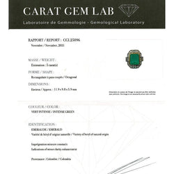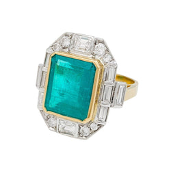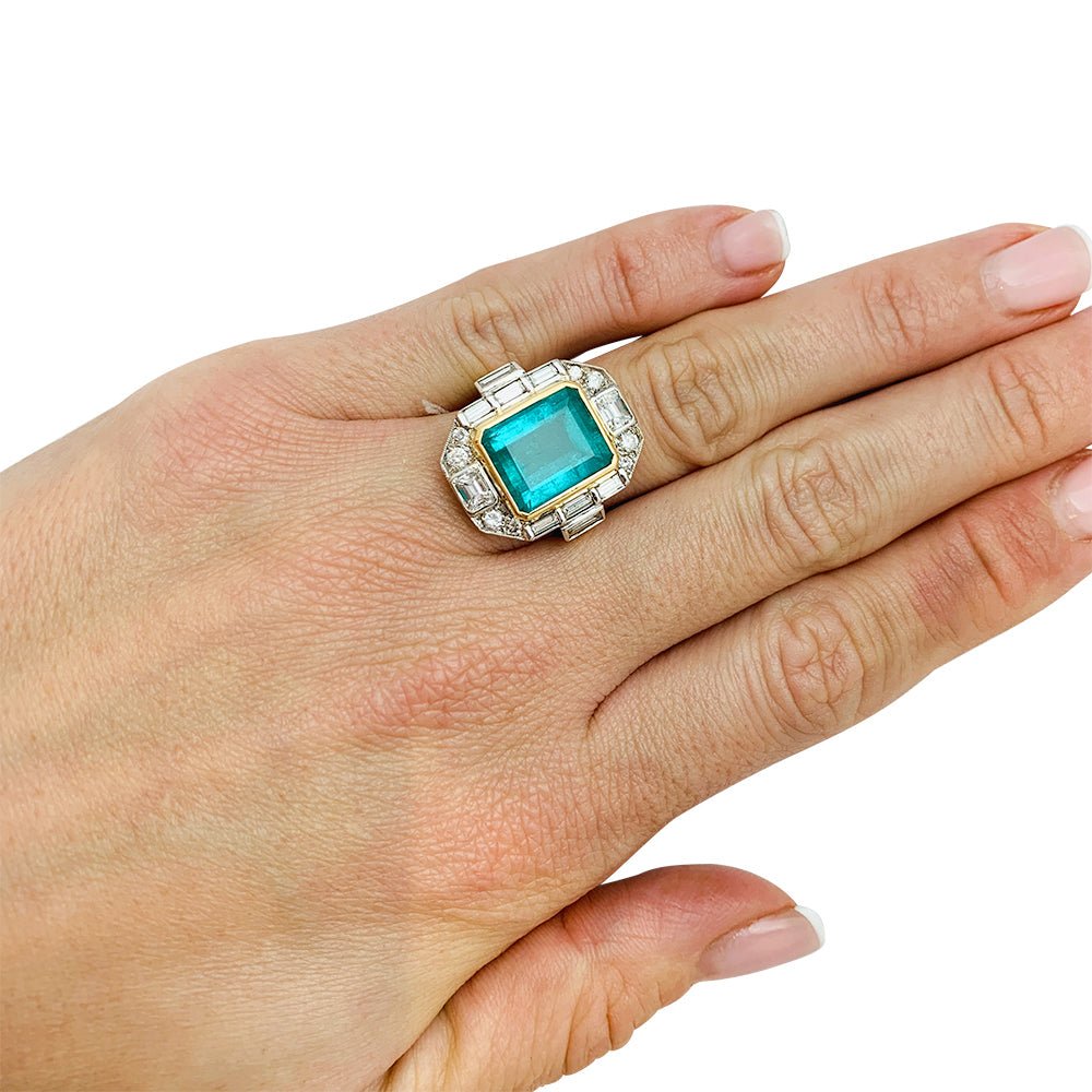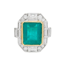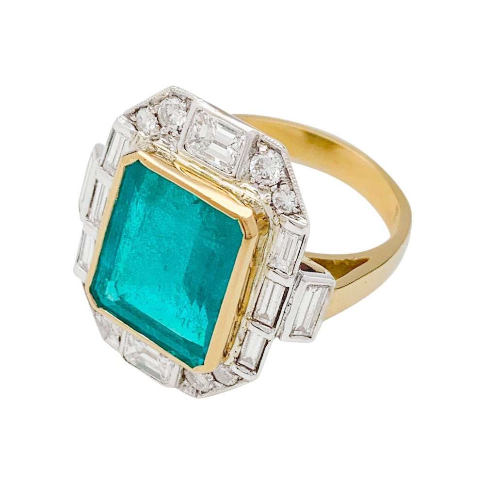 A two-tone 750/000 gold ring centered on a large rectangular Colombian emerald of approximately 5 carats surrounded by round and baguette diamonds. Carat Gem Lab Certificate. Length: 21 mm Width: 19 mm Weight: 7.8 grams Finger size: 55