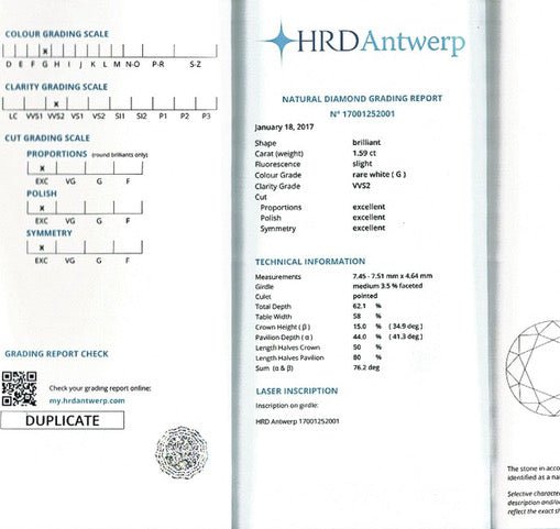 A solitaire ring in 750/000 white gold centered on a 1.59 carat brilliant-cut diamond, G color, VVS2 purity, set on 6 claws. HRD certificate. Weight: 6.2 grams Finger size: 57