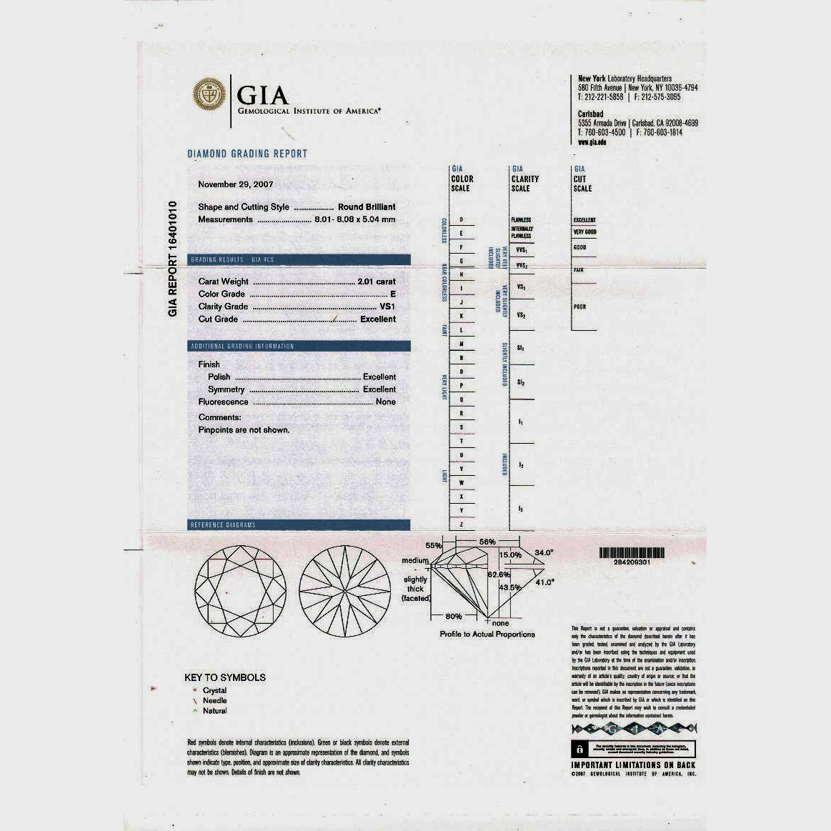 A solitaire ring in 950/000 platinum centered on a brilliant-cut diamond weighing 2.01 carats, color G, clarity VS1, set on 4 prongs. GIA certificate. Weight: 6 grams Diamond weight: 2.01 carat Finger size: 51