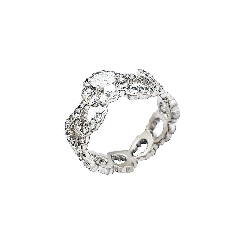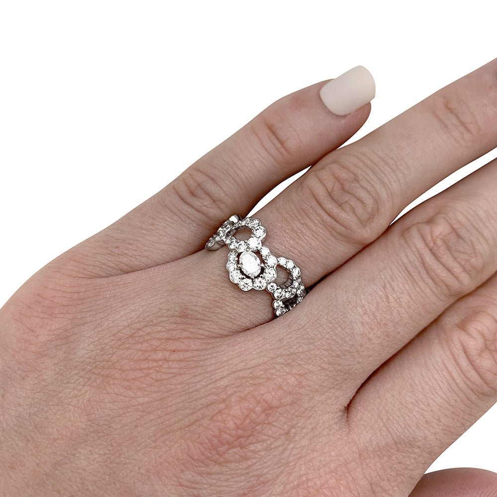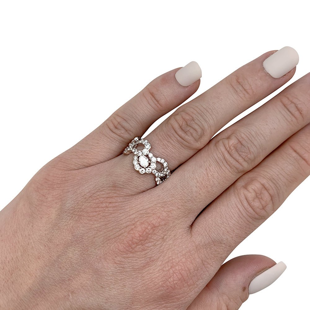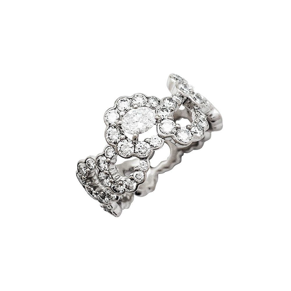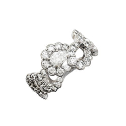A ribbon ring signed by Maison Dior, “Archi” model, in 750/000 white gold, entirely set with diamonds, centered with a larger oval diamond. Design inspired by the “Junon” dress designed by Christian Dior for the “Mid-century” fashion show in 1949. Width: 10mm Weight: 4.8 grams. Diamond weight: approximately 2.14 carats. New price: 19,000 Finger size: 51