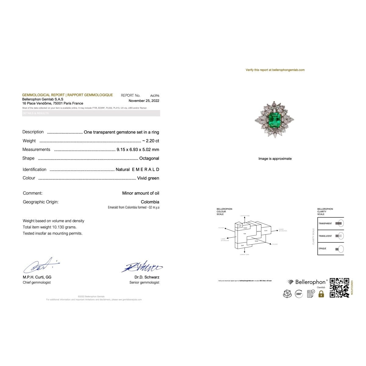 A 750/000 white gold ring set with a rectangular Colombian emerald of 2.12 carats surrounded by a triple surround of round, shuttle and pear diamonds. Length: 24mm Width: 24mm Weight: 10.1 grams Diamond weight: approximately 2.46 ct Finger size: 55