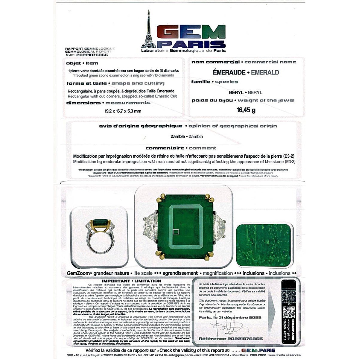 A cocktail ring in 750/000 white gold set with a rectangular emerald with cut sides weighing approximately 11.77 carats supported by half-moon-cut and brilliant-cut diamonds. Certificate from the Gem Paris laboratory. Length: 19.2mm Width: 16.7mm Weight: 16.5 grams Diamond weight: approximately 1.74 ct. Finger size: 52