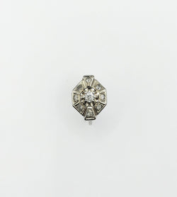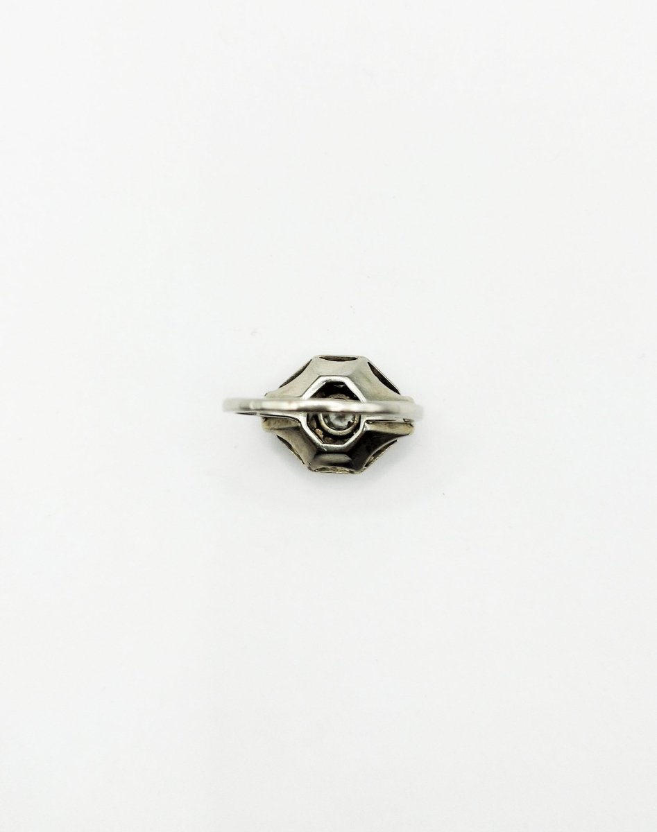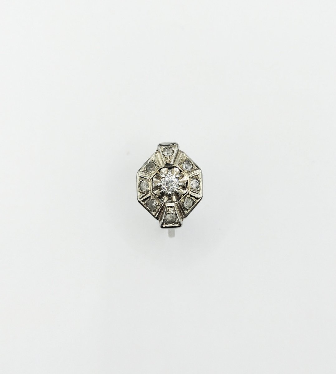 18-carat white gold ring, set with a central diamond surrounded by six small brilliants in geometric reserves. Solder marks on the ring Total weight: 2.86g. Finger size: 51