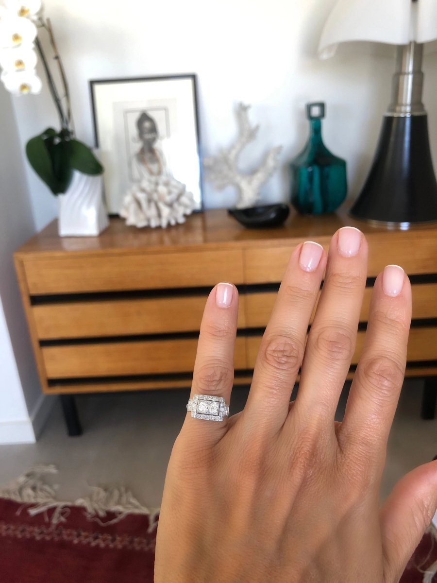 Old ring with a rectangular top set with 2 old-cut diamonds on its top. The entire decoration, as well as the start of the ring, are set with 8/8 cut diamonds. Material: Platinum Hallmark: dog head Weight: 3.1 grams Length: 1.2cm Width: 0.9cm Adjustable finger size: 51.5 Number of stones: 27 diamonds Total Carat: 2 center stones 0.20 ct x 2 Period: 1930