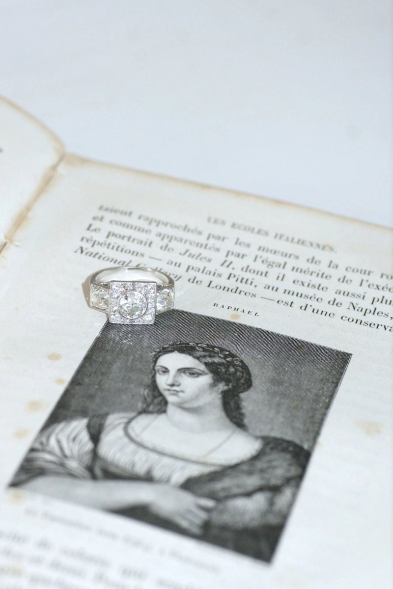 Art Deco Platinum Engagement Ring (hallmark: Mascaron) , set in its center with an old-cut diamond, weighing approximately 0.70 Ct (estimated color J, purity P) supported by two old-cut diamonds weighing approximately 0.55 Ct and 0.50 Ct (estimated color K, VS and SI purity). Surrounding of old-fashioned and 8x8 cut diamonds whose total weight is estimated at approximately 0.45 Ct. Circa 1930, Art Deco. Gross weight: 4.61g Finger size: 50 (diameter 15.90/US 5.25). Pattern height: 1.00cm Pattern width: 2.00cm Condition: slight micro scratches on the gold and platinum parts, shock and missing on the central diamond, slight wear on the setting, see photos. The diamond crystallizes between 150 and 750km under the Earth's mantle. At this depth, the pressure is more than 50,000 times higher than atmospheric pressure. This compresses the atoms together, which gives the diamond its great hardness and brilliance. All our engagement rings.