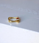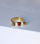 Modernist style ring in 18Kt yellow gold (hallmark: owl) with oblong head set with coral and horn. Vintage Swiss work, circa 1970. Gross weight: 8.90g Height of central motif: 0.60 cm Width of central pattern: 2.50 cm Ring size: 55 (diameter 17.50/ US 7.00) Condition: very light micro scratches on the gold parts, see photos. The Modernist style is essentially characterized by clean and modern forms, inspired by the mechanical world. All our antique rings.