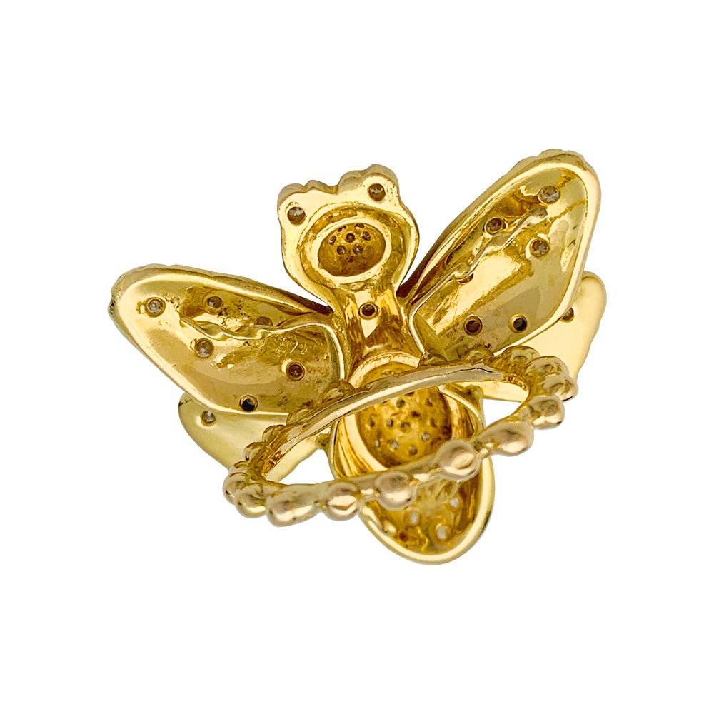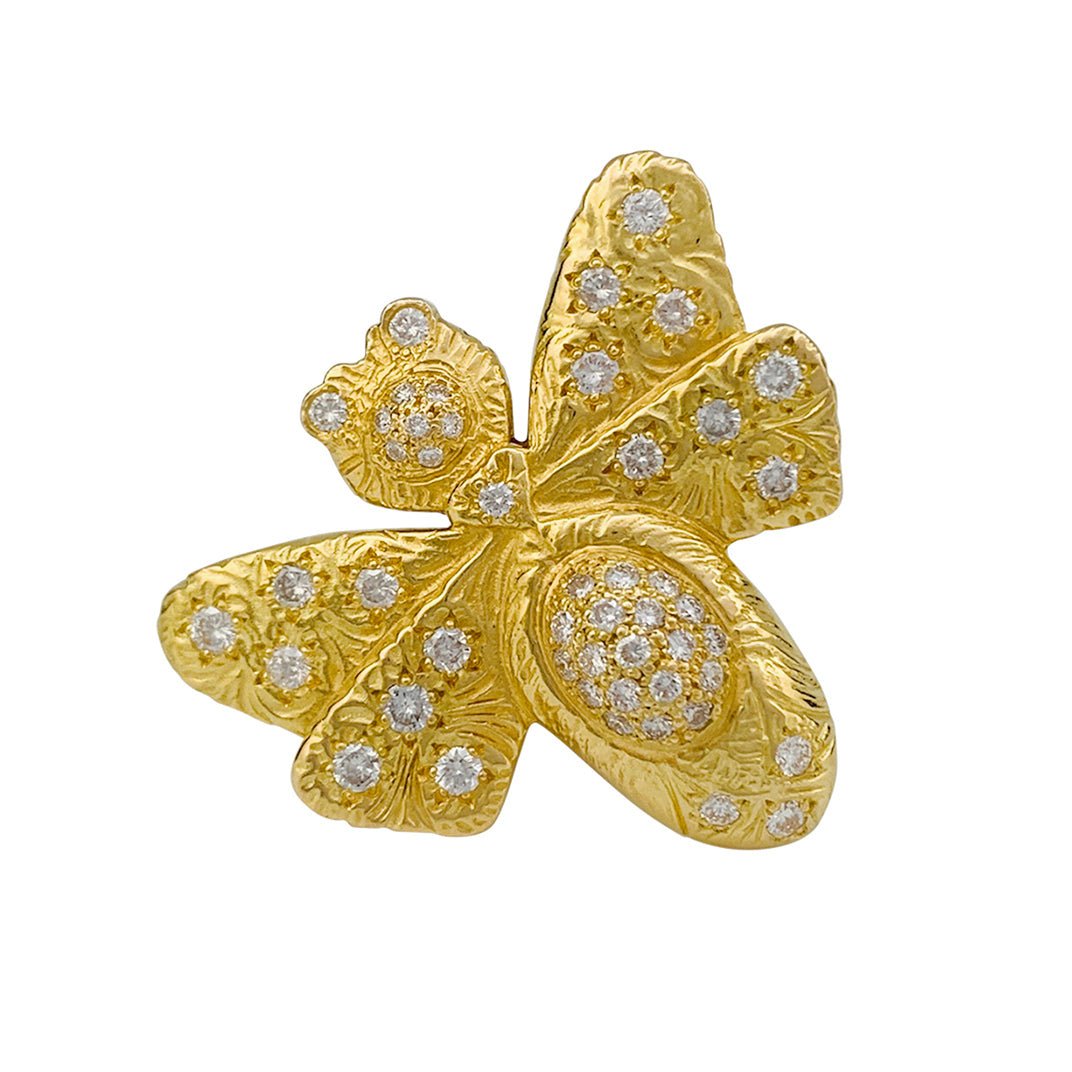 A Garnazelle ring featuring a butterfly in chiseled 750/000 yellow gold, enhanced with brilliant-cut diamonds. Length: 31mm Width: 39mm Height: 7mm Weight: 20 grams Diamond weight: approximately 0.80 carat Finger size: 52