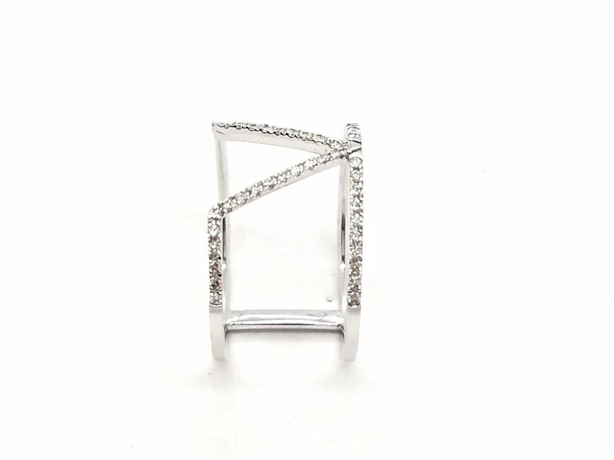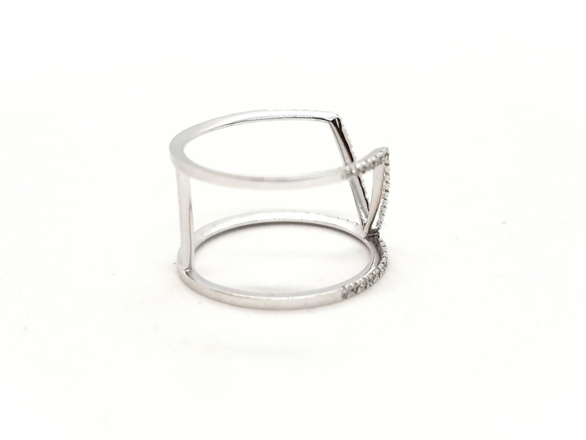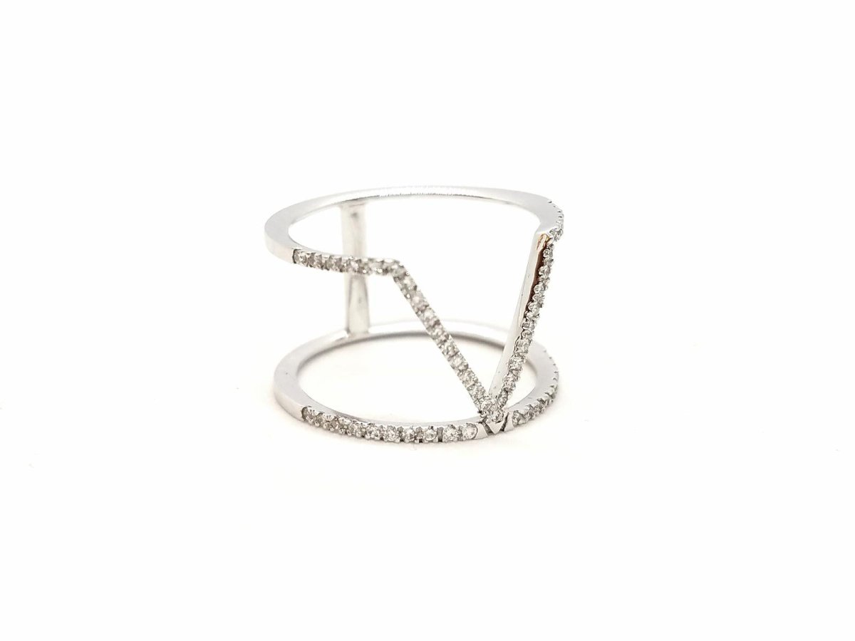 Pretty graphic ring in 750 thousandths (18 carat) white gold. paved with 51 brilliant-cut diamonds for a total of 0.40 ct. finger size: 53. total width of the pattern on the top: 1.24 cm. width of diamond lines: 0.10 cm. total weight: 2.65 g. eagle head hallmark. new condition