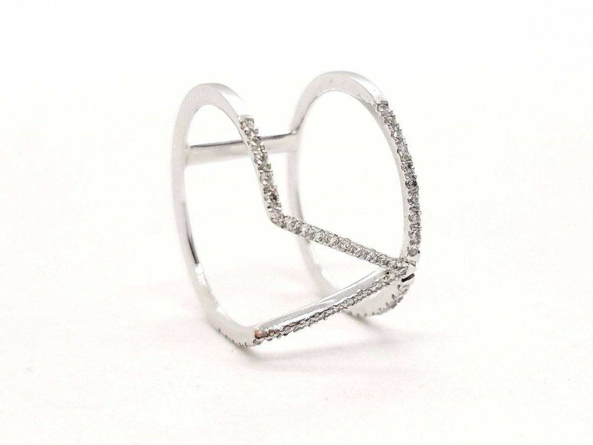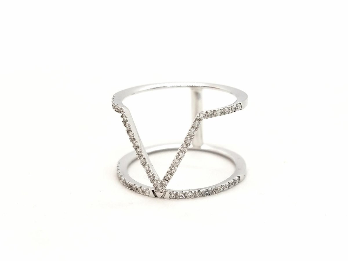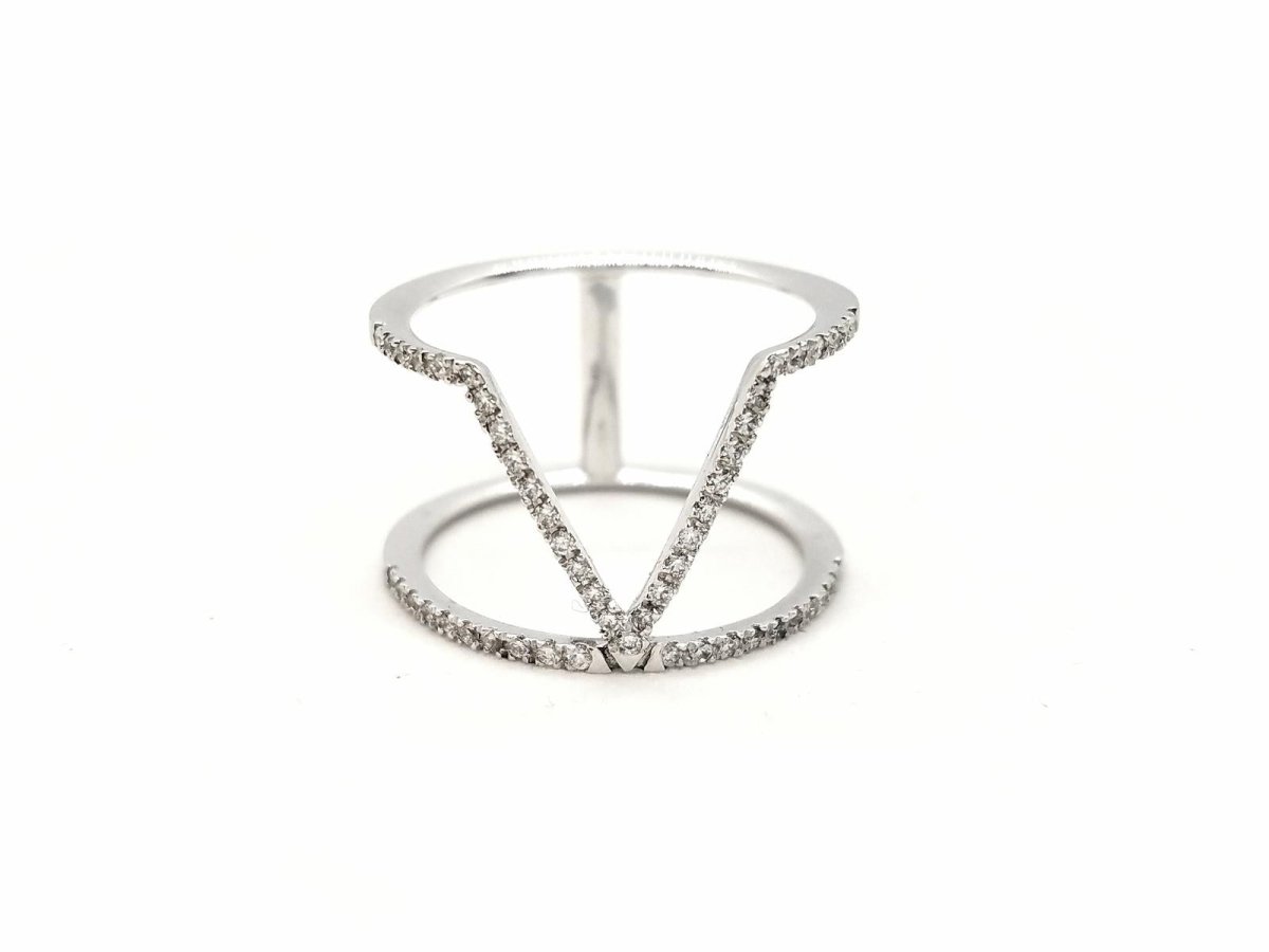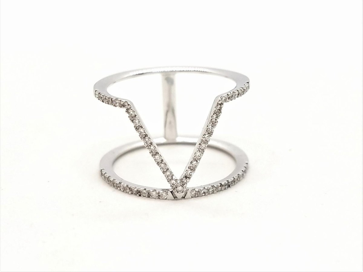 Pretty graphic ring in 750 thousandths (18 carat) white gold. paved with 51 brilliant-cut diamonds for a total of 0.40 ct. finger size: 53. total width of the pattern on the top: 1.24 cm. width of diamond lines: 0.10 cm. total weight: 2.65 g. eagle head hallmark. new condition