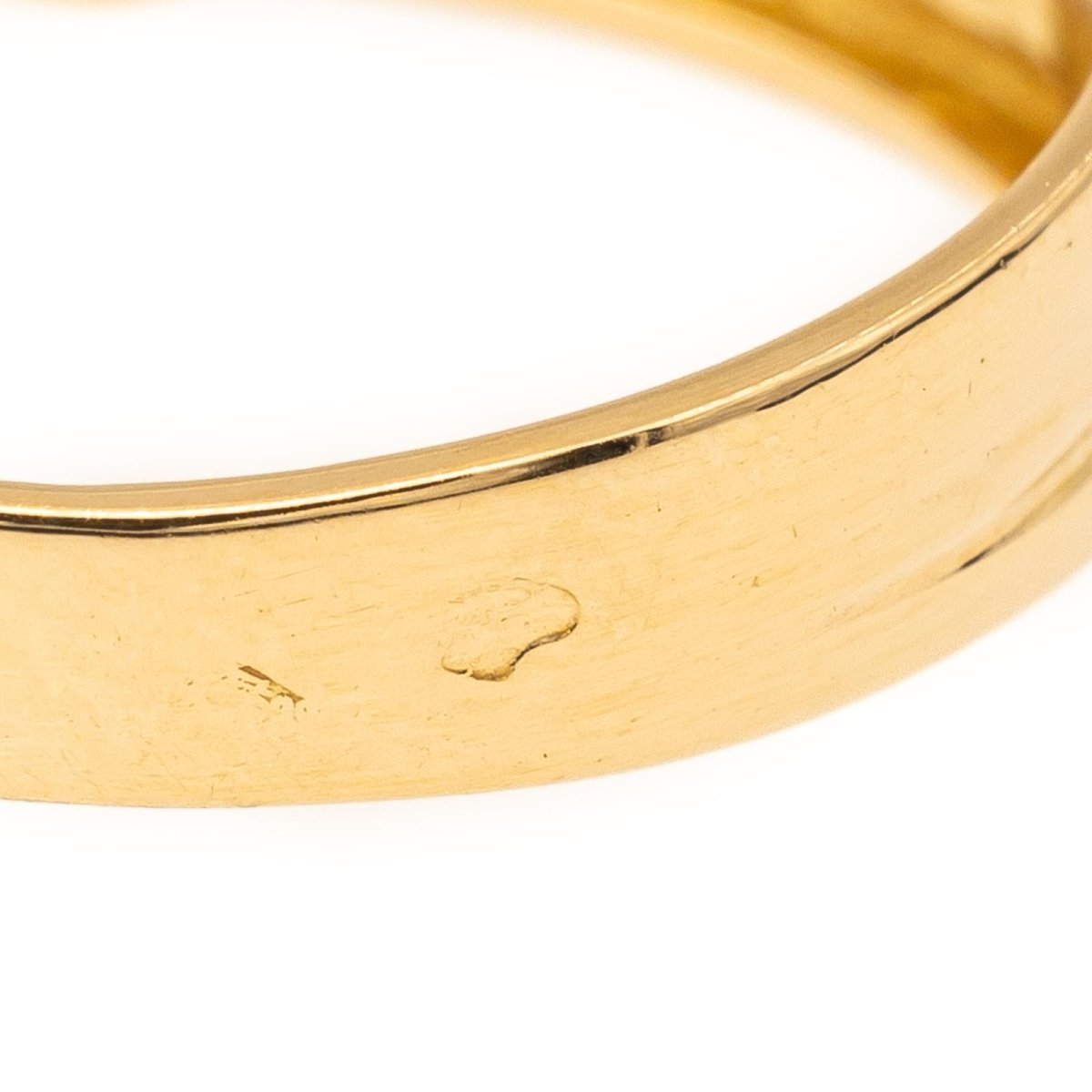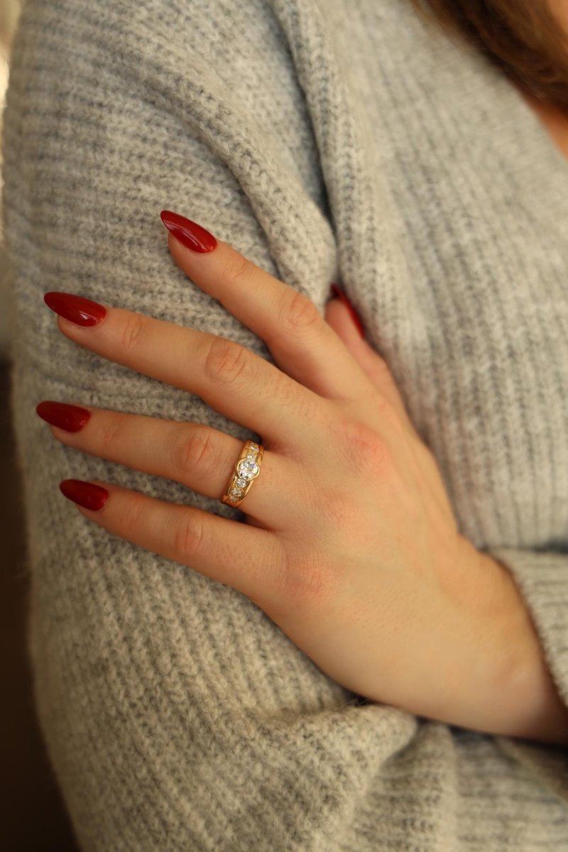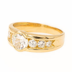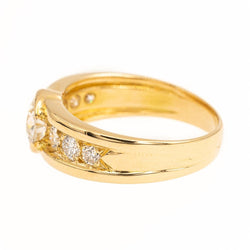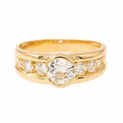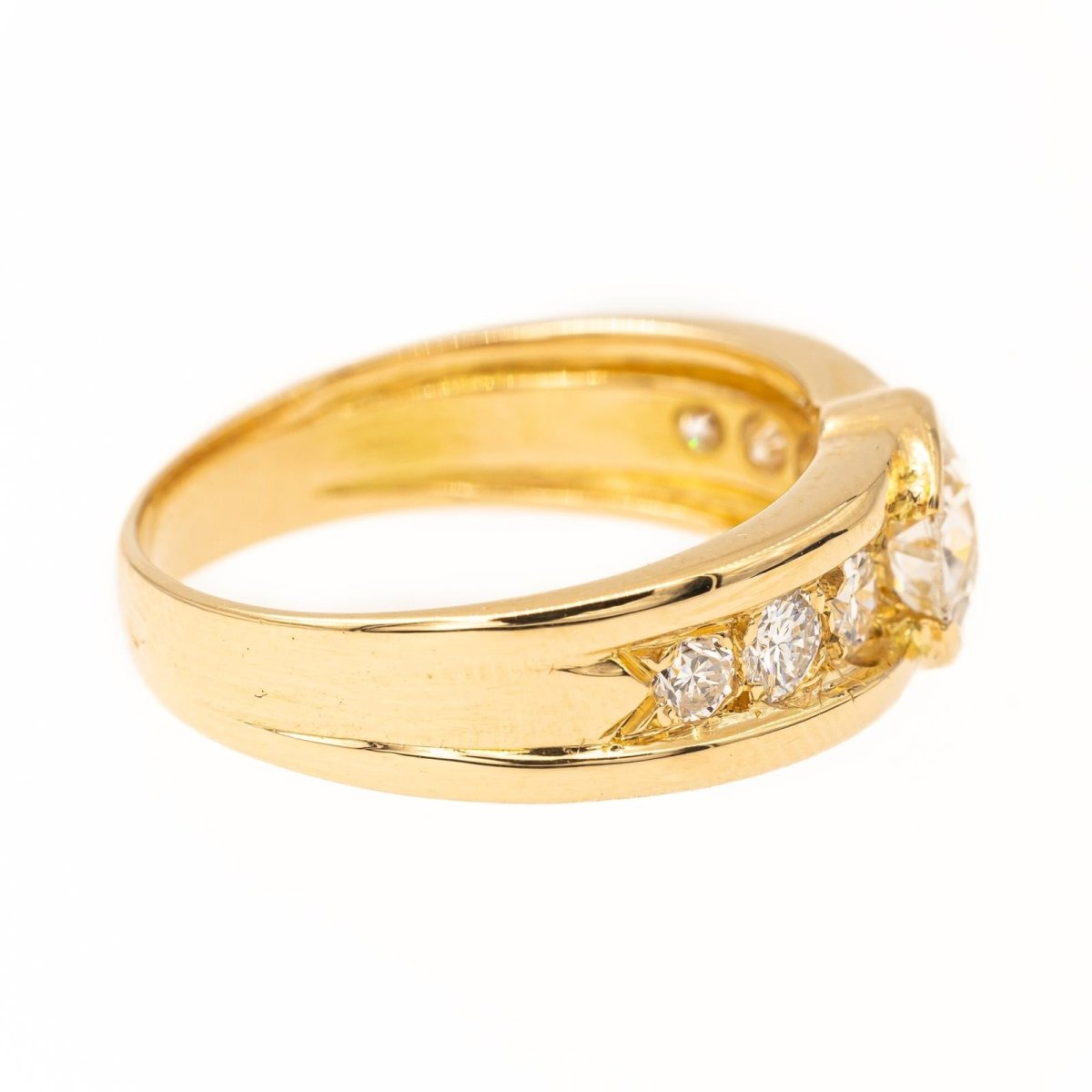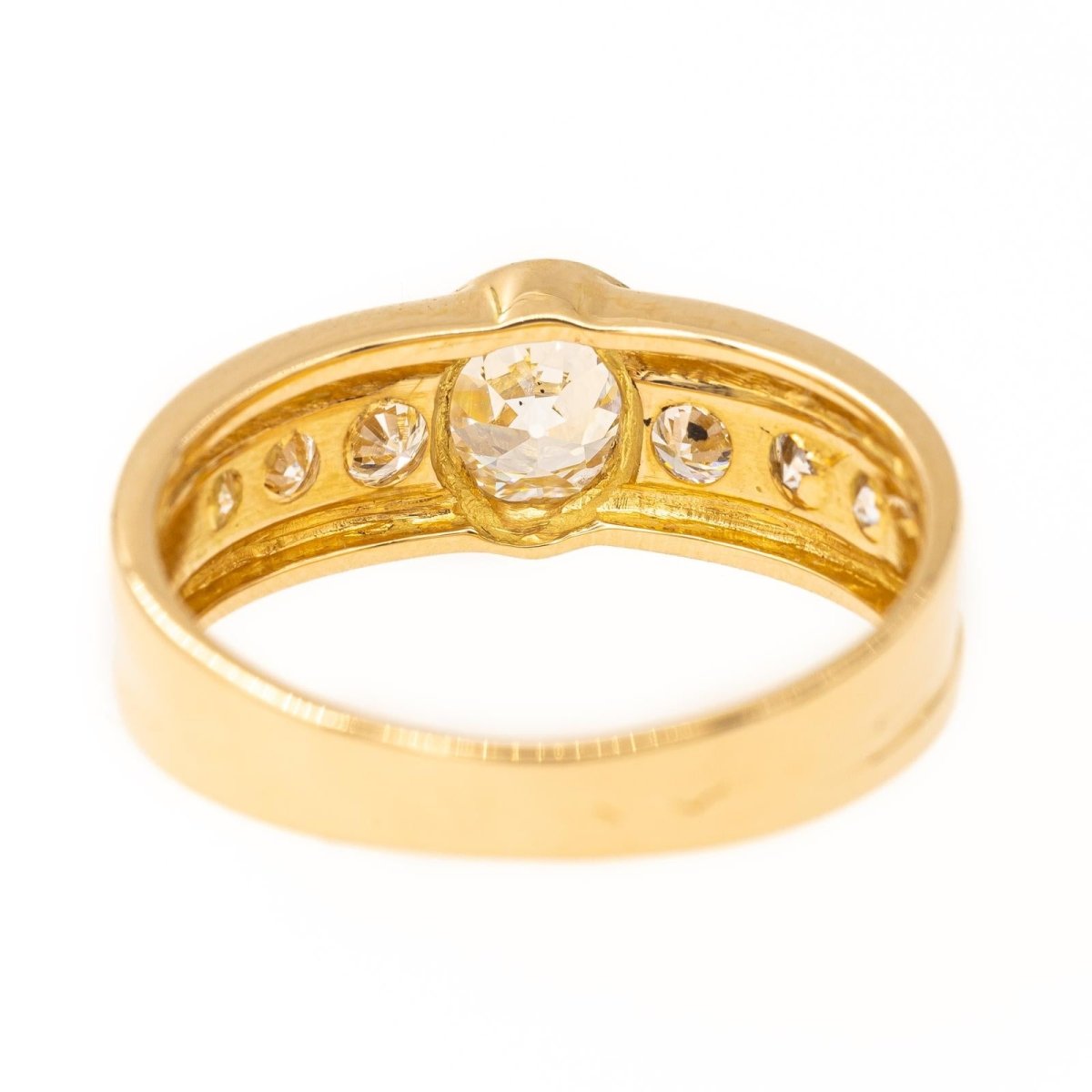 Ring in 18-carat yellow gold, set with 7 old-cut diamonds and a central diamond with a total weight of approximately 0.75 ct. Surrounded by 6 diamonds, 2 of approximately 0.09 ctc each, 2 of approximately 0.06 ct each and 2 of approximately 0.04 ct each. Total weight of diamonds: 1.13 cts width on top: 0.70 cm Finger size: 52 Total weight: 3.60 g Eagle head hallmark