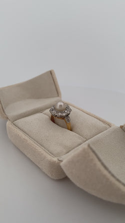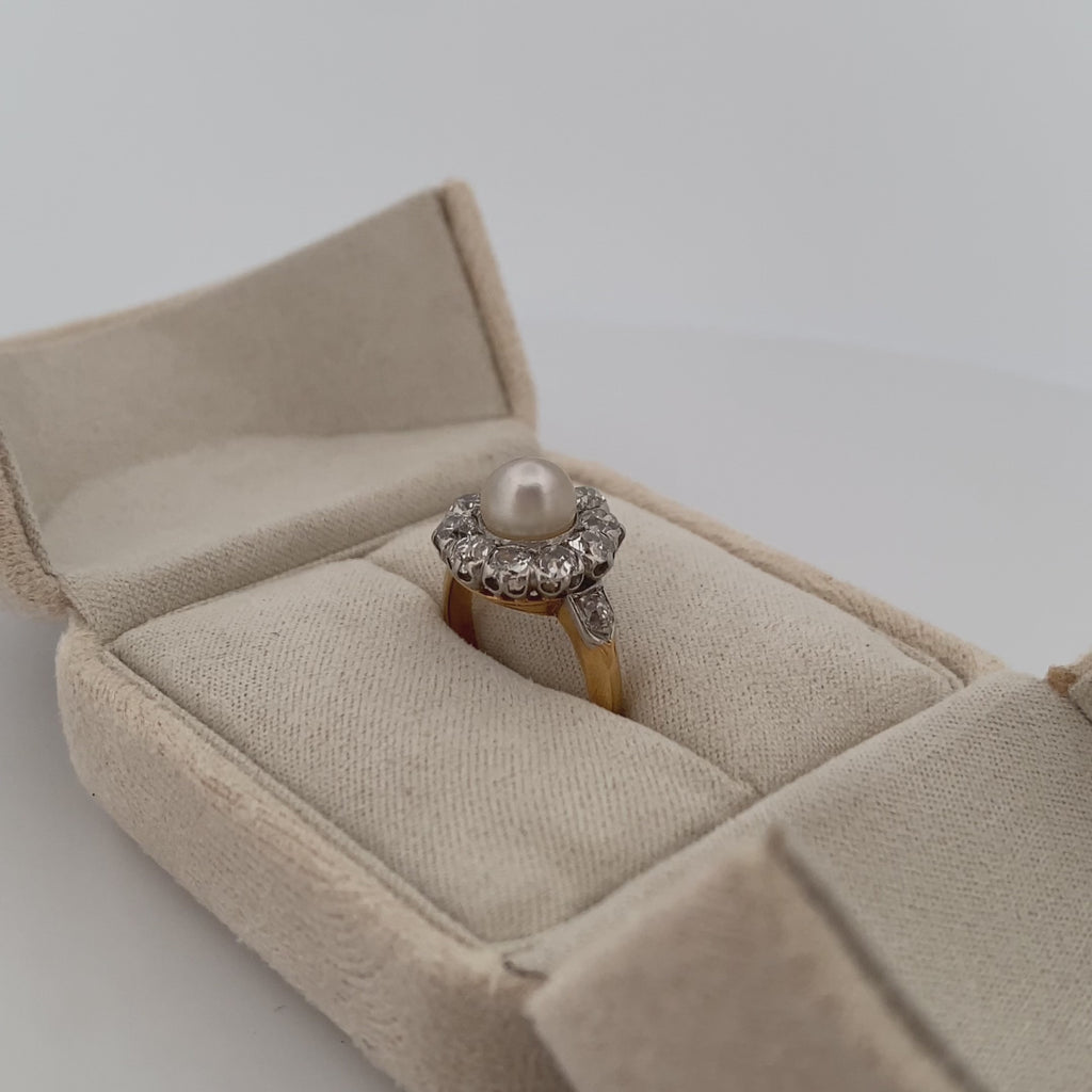 Marguerite ring in 18-carat yellow gold and white gold, in the center a pearl surrounded by old-cut diamonds. Finger size: 50 Weight: 5.16g 1900s-1920s.