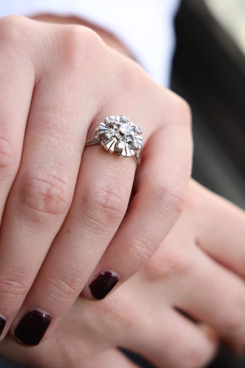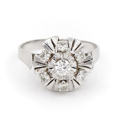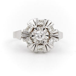 Retro daisy ring in 750 thousandths (18 carat) white gold. set with a central brilliant-cut diamond of approximately 0.19 ct. and 6 brilliant-cut diamonds of approximately 0.06 ct each. Total weight of diamonds: 0.55 ct. Finger size: 53. Width on top: 1.28 cm. Total weight: 4.34 g. Eagle head hallmark. Excellent condition