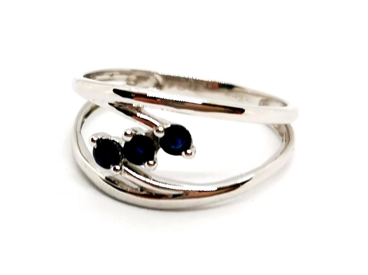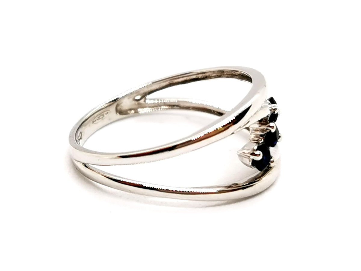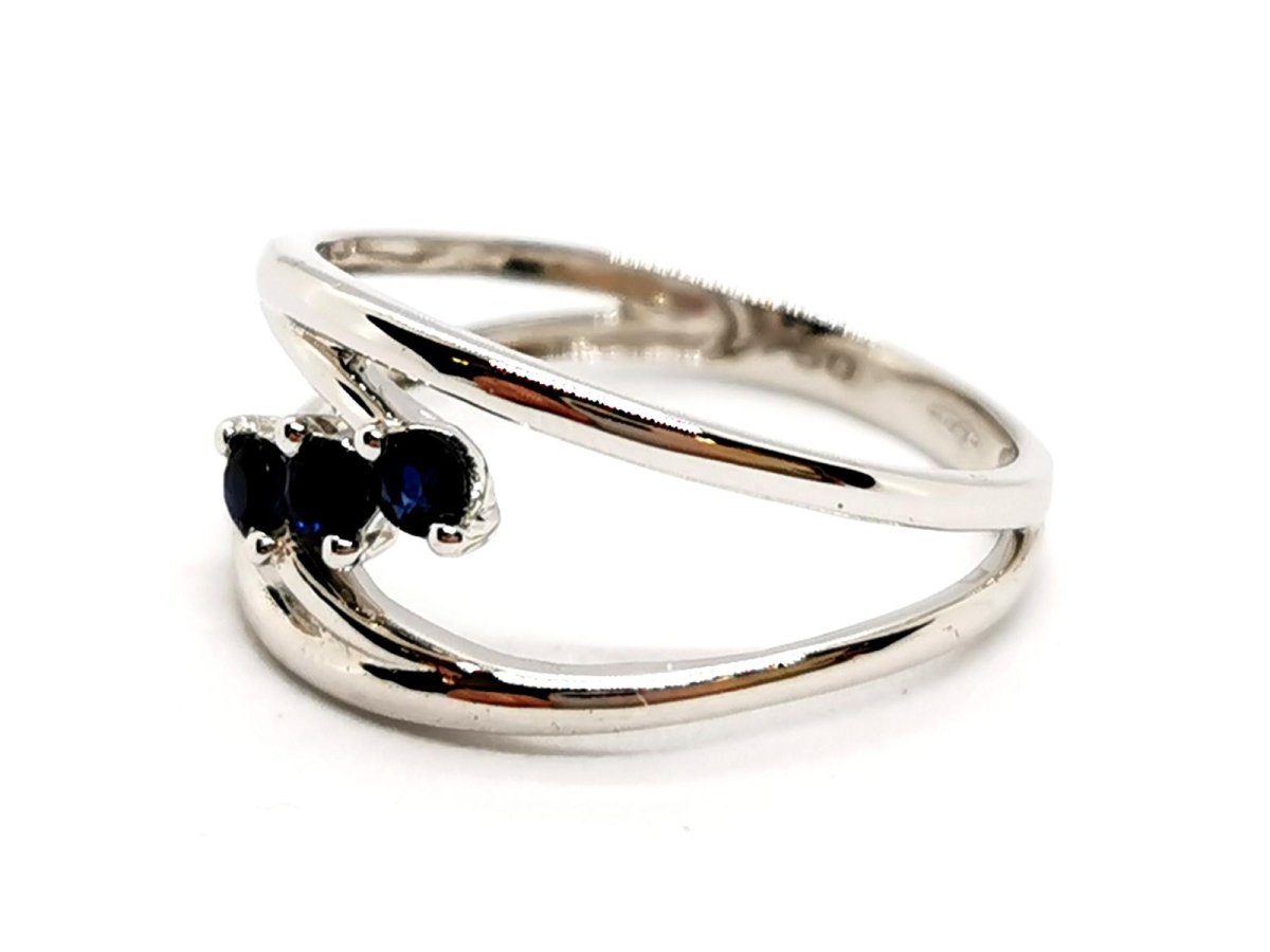 Ring in 750 thousandths (18 carat) white gold. set with 3 brilliant-cut sapphires. of approximately 0.06 ct each. total weight of sapphires: approximately 0.18 ct. finger size: 58. width on top: 1.02 cm. total weight: 2.95 g. eagle head hallmark. new condition