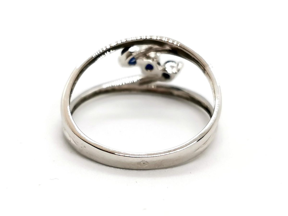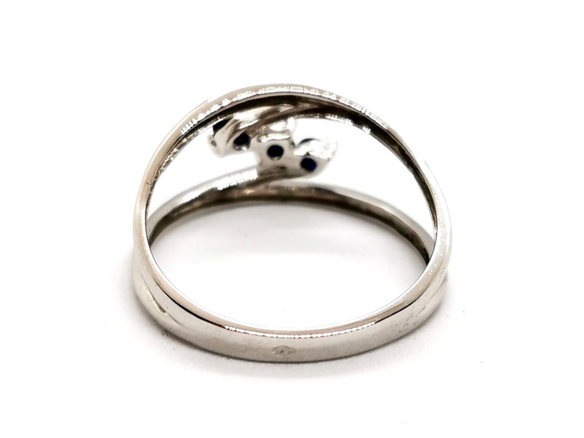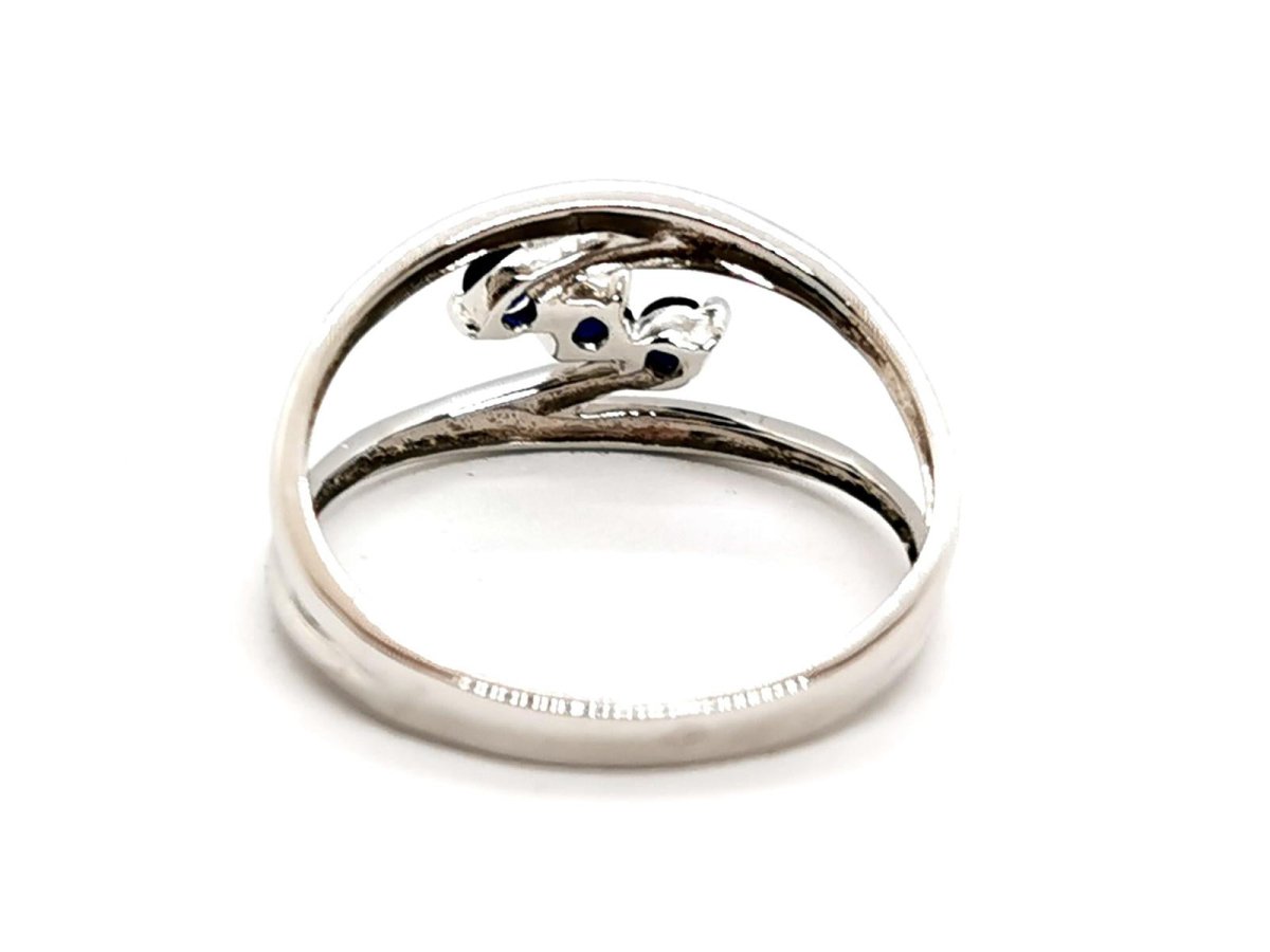 Ring in 750 thousandths (18 carat) white gold. set with 3 brilliant-cut sapphires. of approximately 0.06 ct each. total weight of sapphires: approximately 0.18 ct. finger size: 58. width on top: 1.02 cm. total weight: 2.95 g. eagle head hallmark. new condition