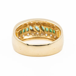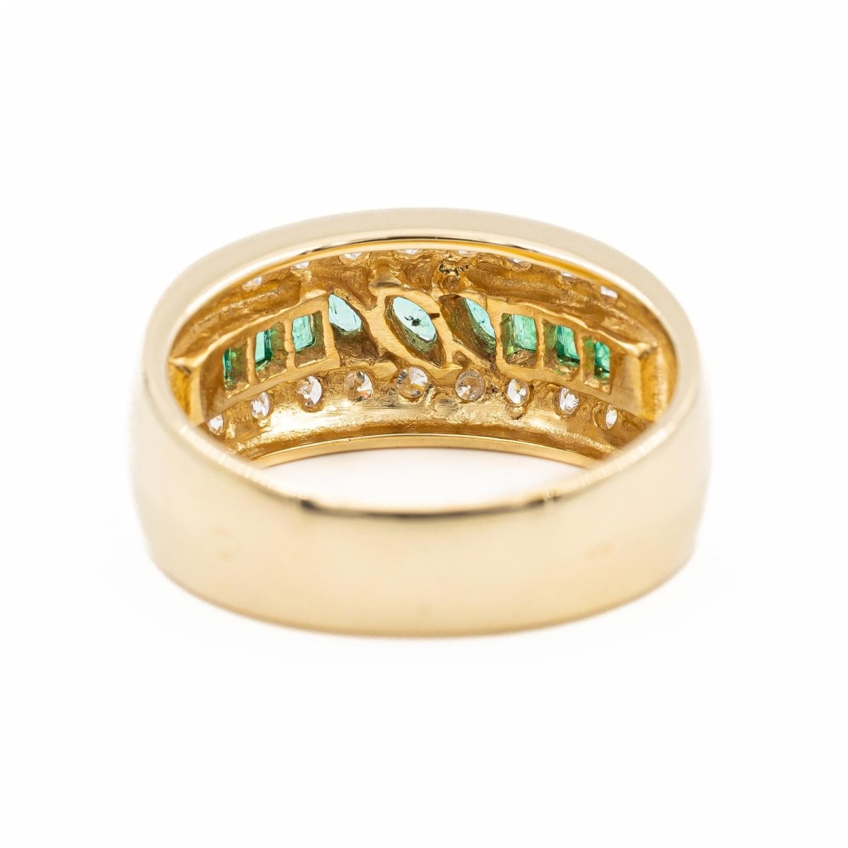 Bandeau ring in 18-carat yellow gold set with 3 marquise-cut emeralds of approximately 0.07 carat each, 6 calibrated square-cut emeralds of approximately 0.02 carat each and 18 brilliant-cut diamonds of approximately 0.01 carat each. Total weight of emeralds: 0.33 carat Total diamond weight: 0.18 ct Finger size: 54 Width on top: 0.87 cm Total weight: 7.35 g Hallmark: eagle head