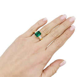 A 750/000 yellow gold ring set with an emerald-cut emerald of approximately 3.04 carats supported by falling baguette-cut diamonds. Bellerophon Certificate No. A11201 indicating Colombia, “Minor amount of oil” Width: 12mm Height: 7mm Weight: 9.2 grams Finger size: 56