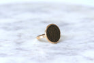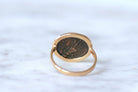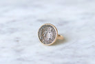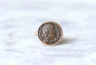 18kt rose gold ring (hallmark: owl) decorated with an ancient Roman copper coin. The coin, a "nummus", presents on the obverse a profile portrait, possibly that of Flavius ​​Valens, Roman emperor of the 4th century (364-378) haloed with the words "Dominus Noster Valens Pius Felix Augustus" (Our Lord Valens Pious Happy Augustus). The reverse reveals an allegory of Victory holding a crown in the right hand and a palm in the left hand, surrounded by the maxim "Securitas Rei Publicae" (The Security of the Public Good). Artisanal work, handmade in Paris by our workshop, contemporary. Gross weight: 4.40 g Finger size: 53 (diameter 16.85 / US 6.30) Height of the pattern: 1.80 cm Pattern width: 2.00 cm Condition: Partial erasures and oxidation of the piece, very slight micro-scratches on the gold parts, see photos. Galerie Pénélope invites you on a journey with the Odyssey, our first collection created from antique pieces, in a very limited edition. Discover the tale behind the collection. The Odyssey collection