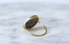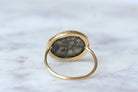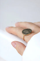 18kt yellow gold ring (hallmark: owl) decorated with an ancient Roman silver coin. The coin, a denarius, features on the obverse the profile of Septimius Severus, Roman emperor of the 2nd-3rd centuries (193-211), surrounded by the inscription "Severus Pius Augustus" (Severus, Pious Augustus). The reverse shows Roma seated holding the palladium in her right hand and a scepter in her left. Behind her, a shield. The figure is surrounded by the maxim "Restitutor Urbis" (The Restorer of the City). Vintage work for the frame. Gross weight: 4.80 g Ring size: 59 (diameter 18.75 / US 8.75) Pattern height: 2.00 cm Pattern width: 1.90 cm Condition: Slight cracks, partial erasing and oxidation of the piece, very slight micro-scratches on the gold parts, see photos. Galerie Pénélope invites you on a journey with the Odyssey, our first collection designed from antique pieces, in a very limited edition. Discover the story behind the collection. The Odyssey Collection