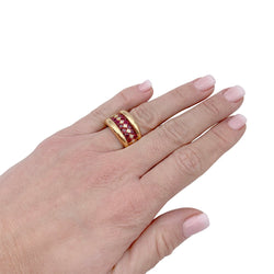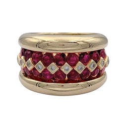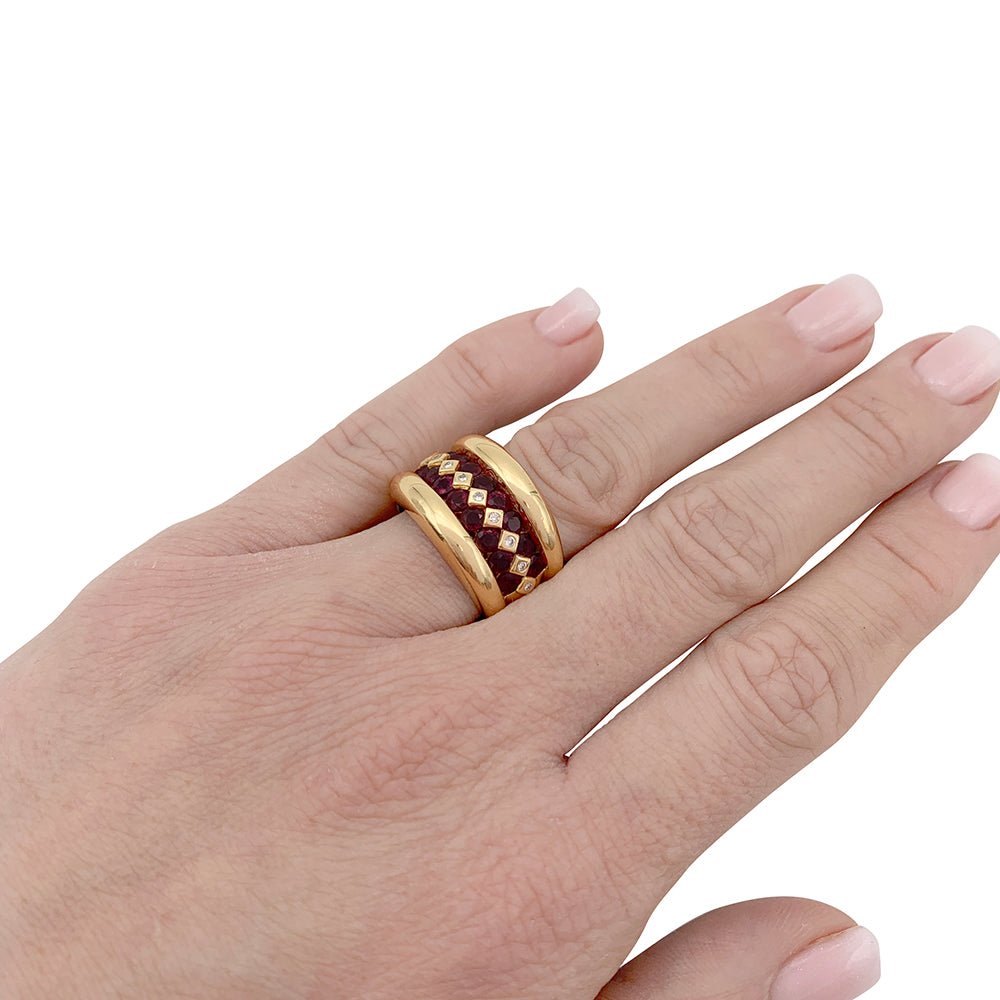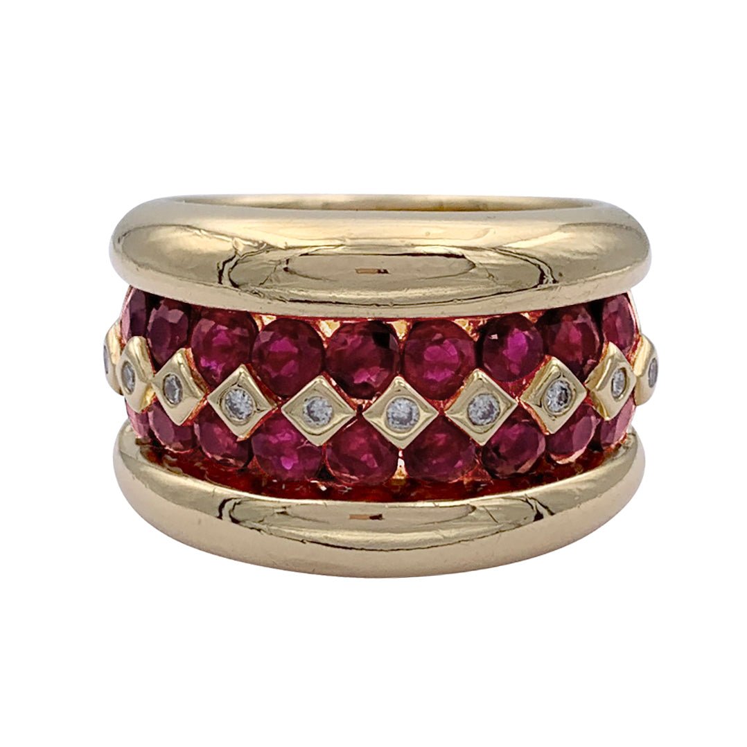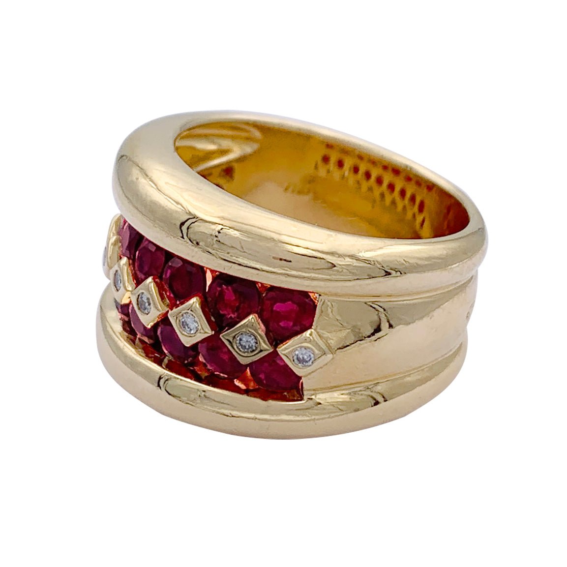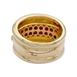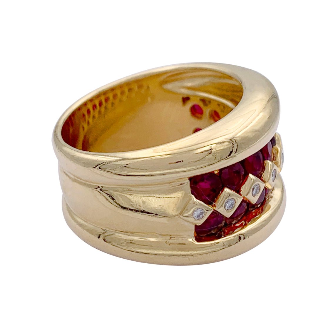A ring signed by Maison Poiray in 750/000 yellow gold forming a double gadroon band centered with 18 round rubies and 10 small diamonds. Estimated total weight of rubies: approximately 1.80 ct. Estimated total weight of diamonds: approximately 0.10 ct. Width: 13mm Weight: 17.5 grams Finger size: 52