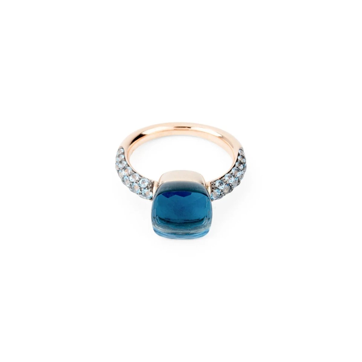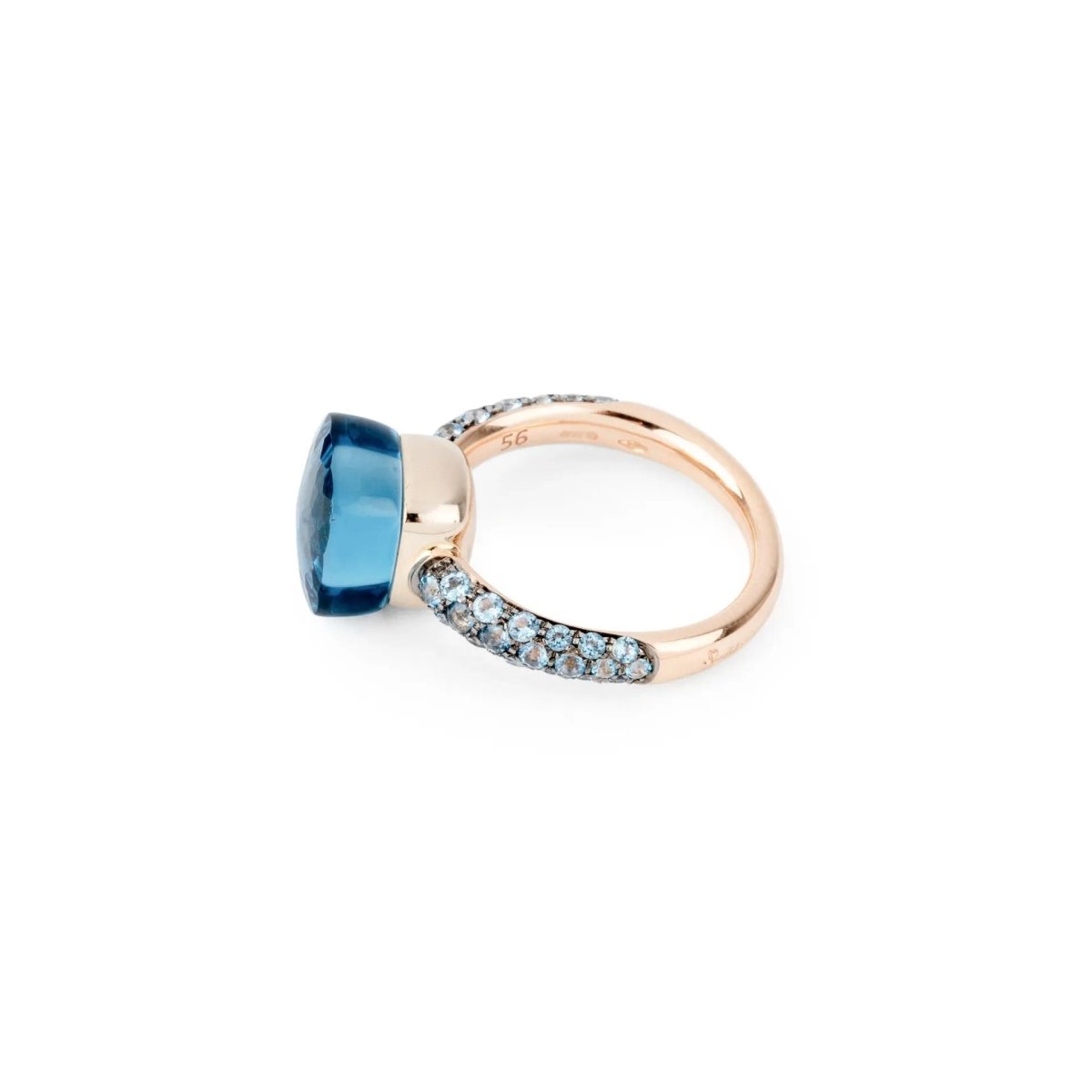 Pomellato Nudo model ring in pink gold and blue topazes in the center and on the sides. Material: 18k Hallmark: Eagle head Weight: 8grs Width: 3mm Adjustable finger size: 56 Number of stones: 39 Period: 2000