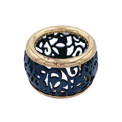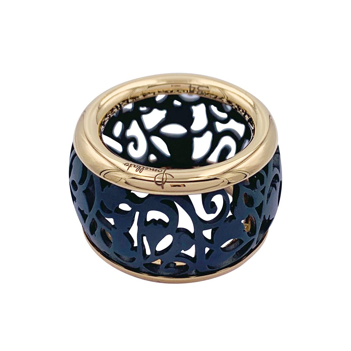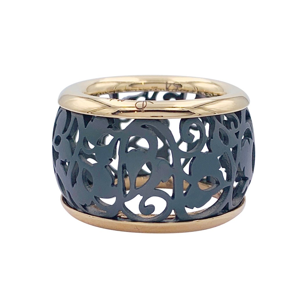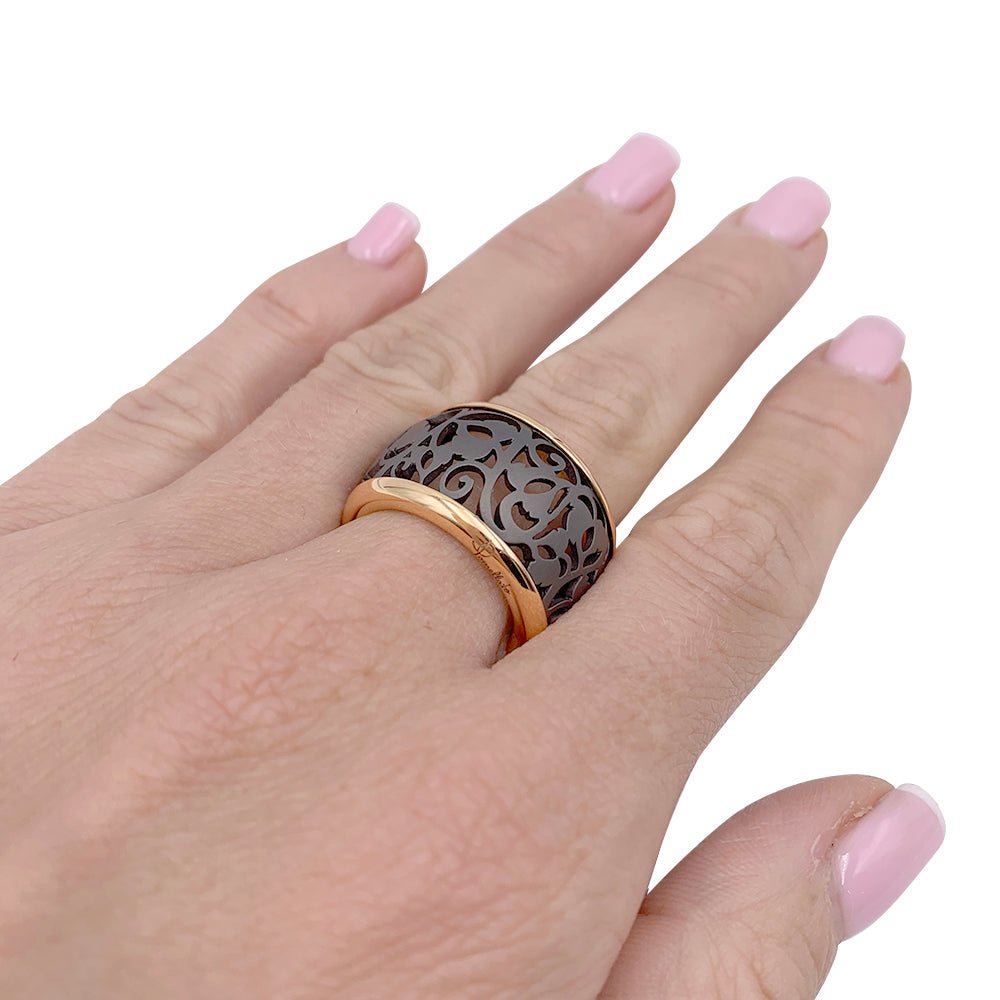 A band ring signed by Maison Pomellato, “Arabesque” collection, in 750/000 pink gold enhanced with openwork floral decoration in brown and matte titanium. Width: 15mm Weight: 8.5 grams. New price: 1890 Finger size: 54