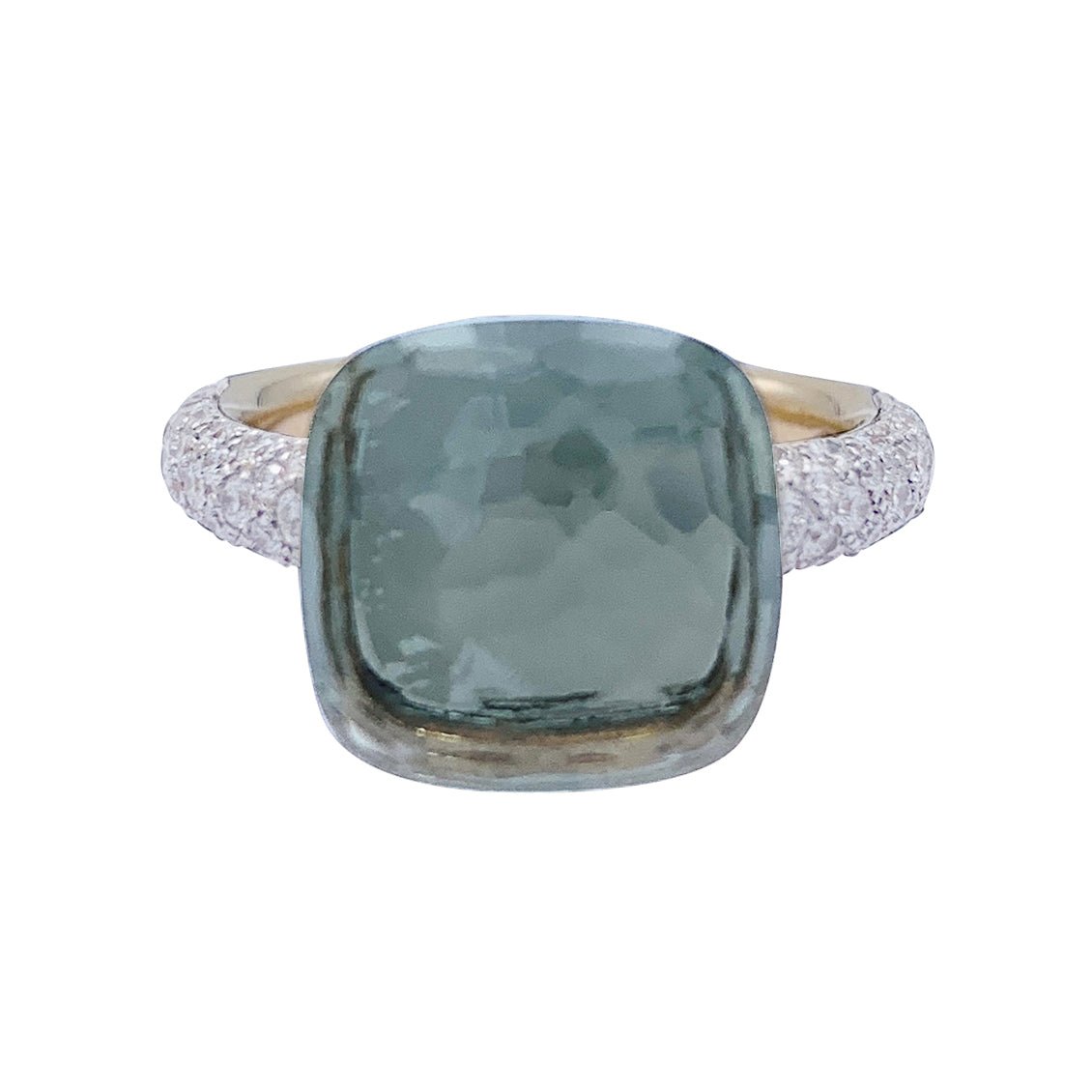 A ring signed by Maison Pomellato, 'Nudo' collection, in 750/000 pink and white gold set with a prasiolite supported by brilliant-cut diamonds. Length: 12mm Width: 12mm Height: 10mm Weight: 9.10 grams Diamond weight: 0.73 ct New price: 6000 Finger size: 57