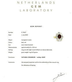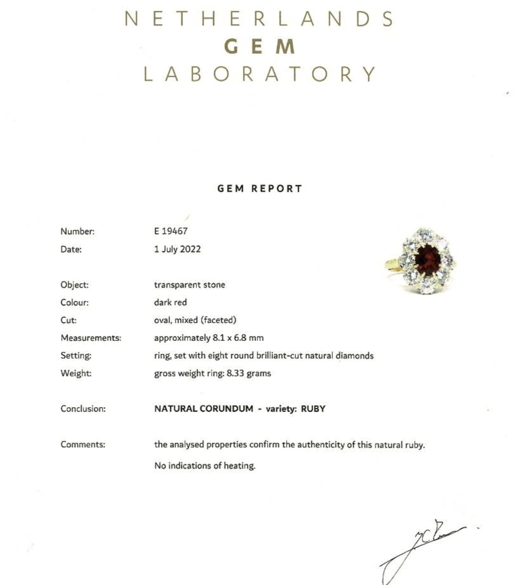 A pompadour ring in 750/000 yellow gold centered on an oval ruby weighing approximately 2.30 carats surrounded by brilliant-cut diamonds. Certificate from the Netherlands Gem Laboratory: Thailand unheated. Length: 18mm Width: 10mm Weight: 8.30 grams Diamond weight: approximately 2.60 ct Finger size: 56